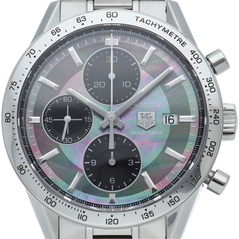 「タグ・ホイヤー カレラ キャリバー16 クロノグラフ」は、角度によって表情を変える華やかでエレガントなデザイン。ダイアルはブラックマザー・オブ・パールを使用したスペシャルエディションで、幻想的な雰囲気を演出してくれます。