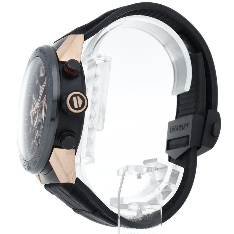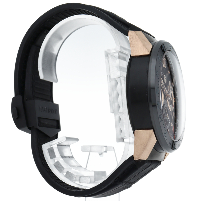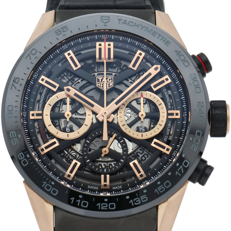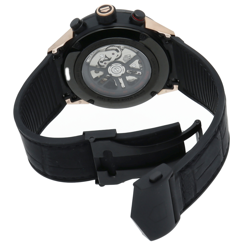 ブラックとローズゴールドのタグ・ホイヤー カレラは、80時間パワーリザーブ機能を備えた自社製ムーブメント、ホイヤー02を搭載しています。 エレガントなブラックアリゲーターレザーと、ラバーを組み合わせたストラップを付属しています。