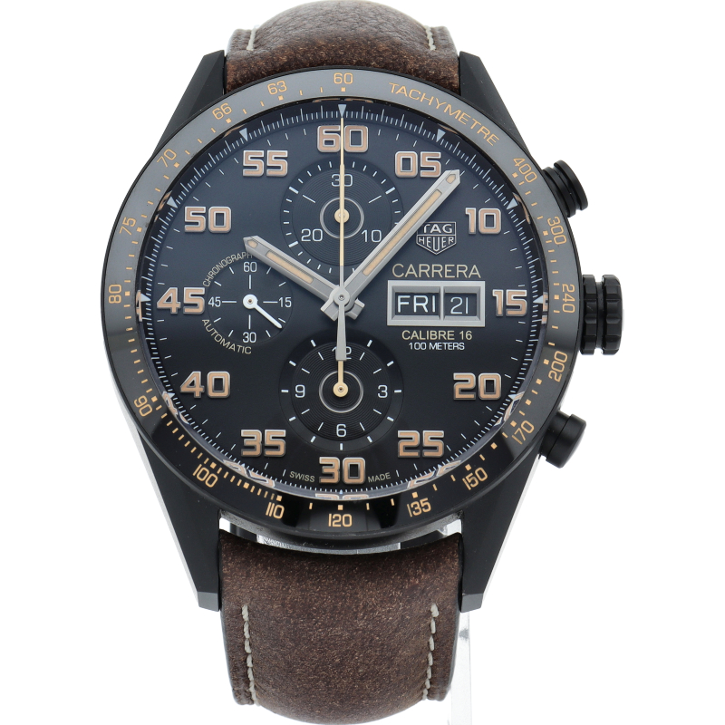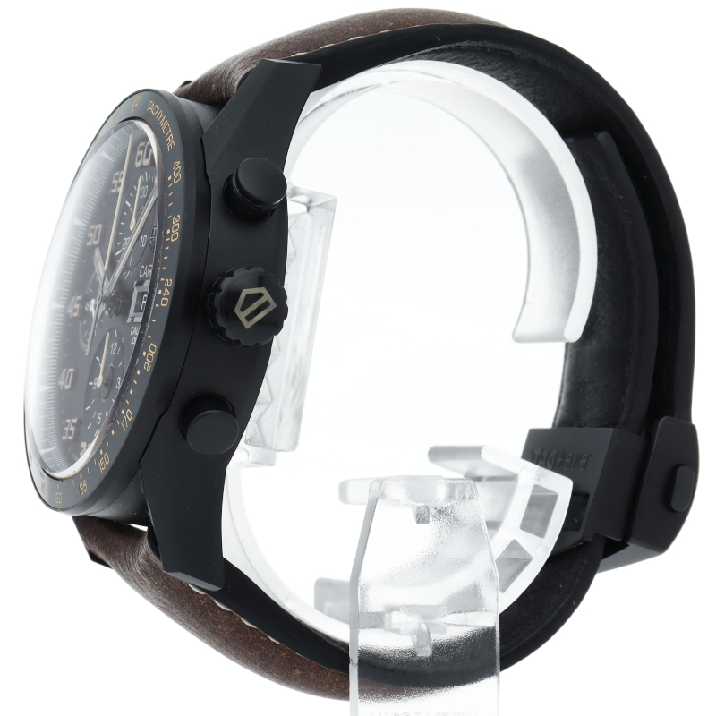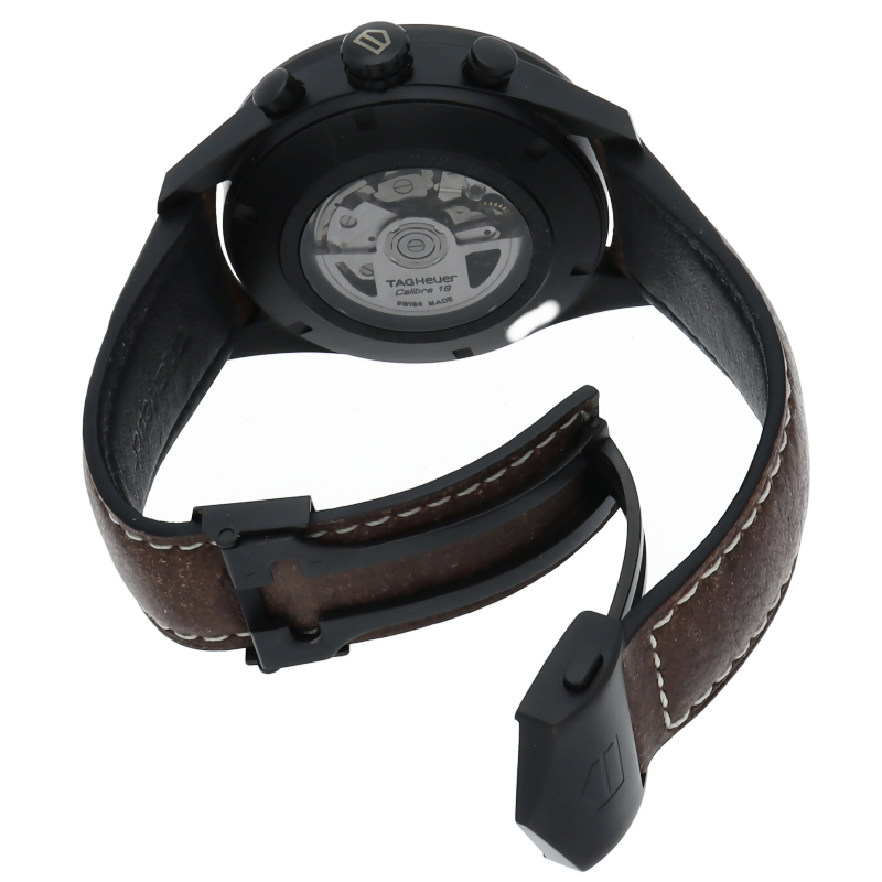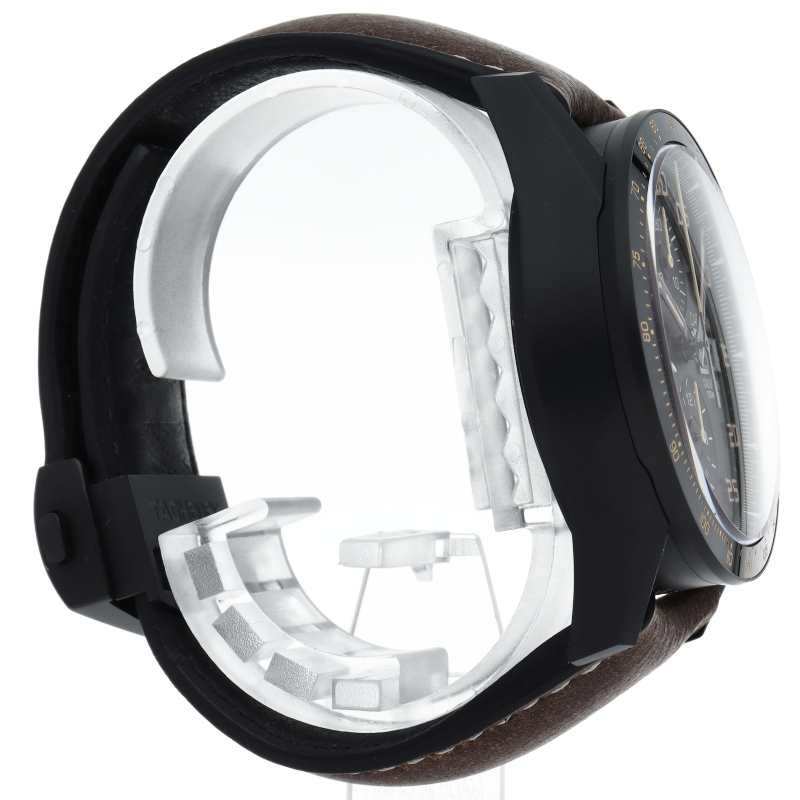 43mmのレーシングからインスピレーションを得たブラックチタン製クロノグラフには、高精度のキャリバー16自動巻ムーブメントが搭載されています。 ダイヤルとセラミック製ベゼルのスタイリッシュなブラックが、カーフレザーストラップの温かみのあるブラウンと絶妙なバランスを取っています。