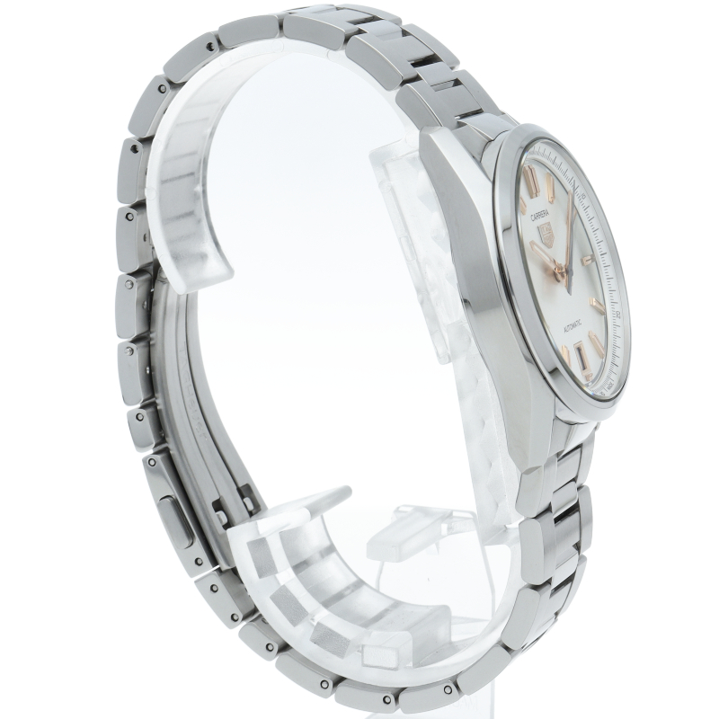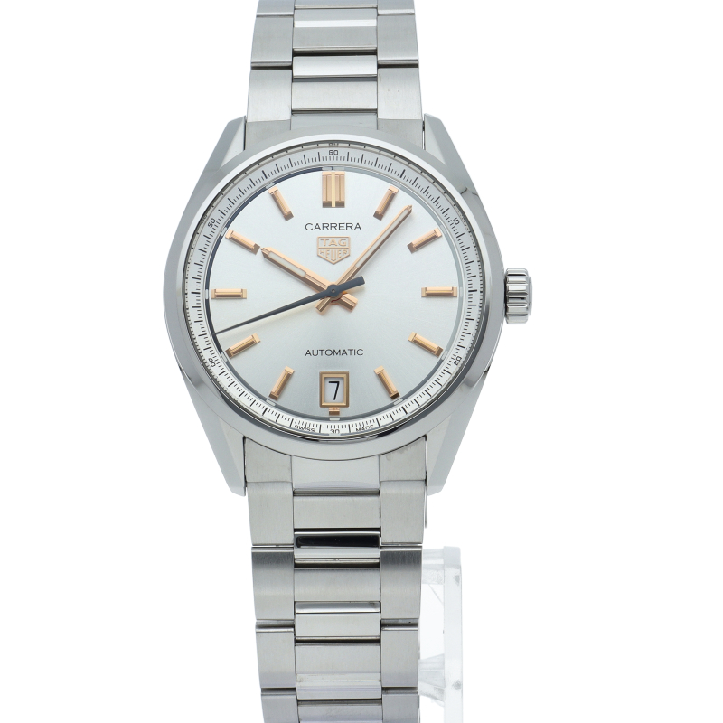 今までのカレラシリーズが持つスポーティーな雰囲気を守りつつ、クラシックかつエレガントなデザインの「カレラ ローズゴールドアクセント」。サンレイ加工のシルバーダイアル上のアワーインデックスと針にローズゴールドメッキを施して高級感を演出しています。