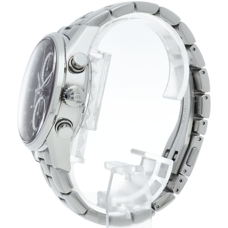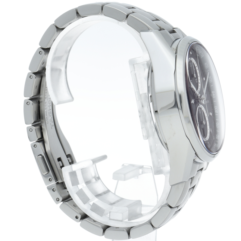 クロノグラフやデイト表示といった機能性も兼ね備えたエレガントな一本です。シャープで洗練された男性的なデザインは、ビジネスシーンにもよく似合います。