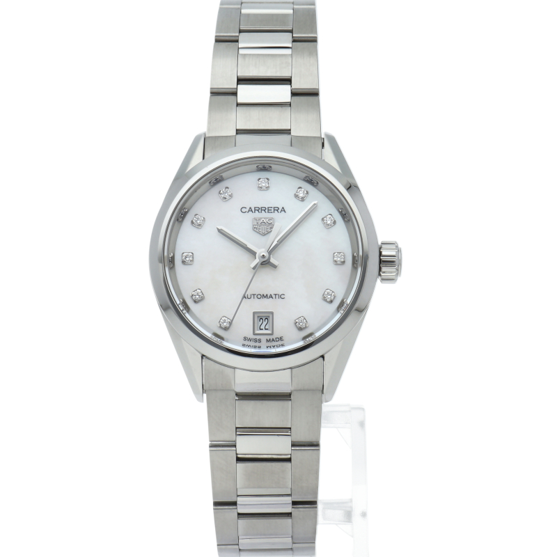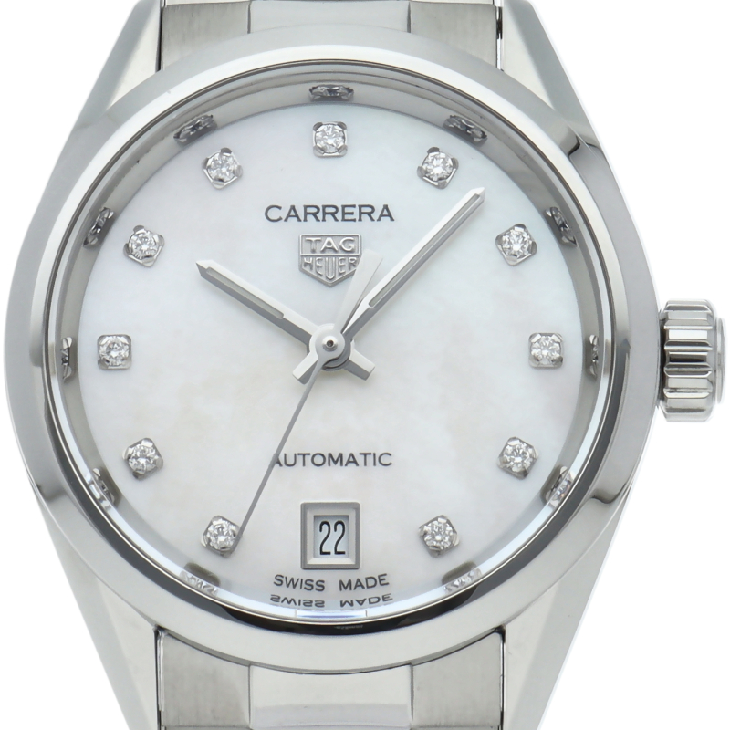 カレラのレディースコレクションキャリバー9の2021年新作モデル。ケース径を28mmか29mmにサイズアップし、スポーティーなイメージになりました。文字盤には11ポイントダイヤをあしらえた、華やかな印象になった1本です。ケースはシースルーバックになっており、自動巻きムーブメントの動きを堪能することができます。