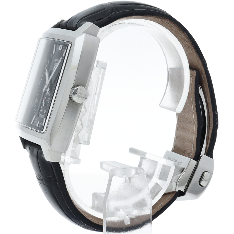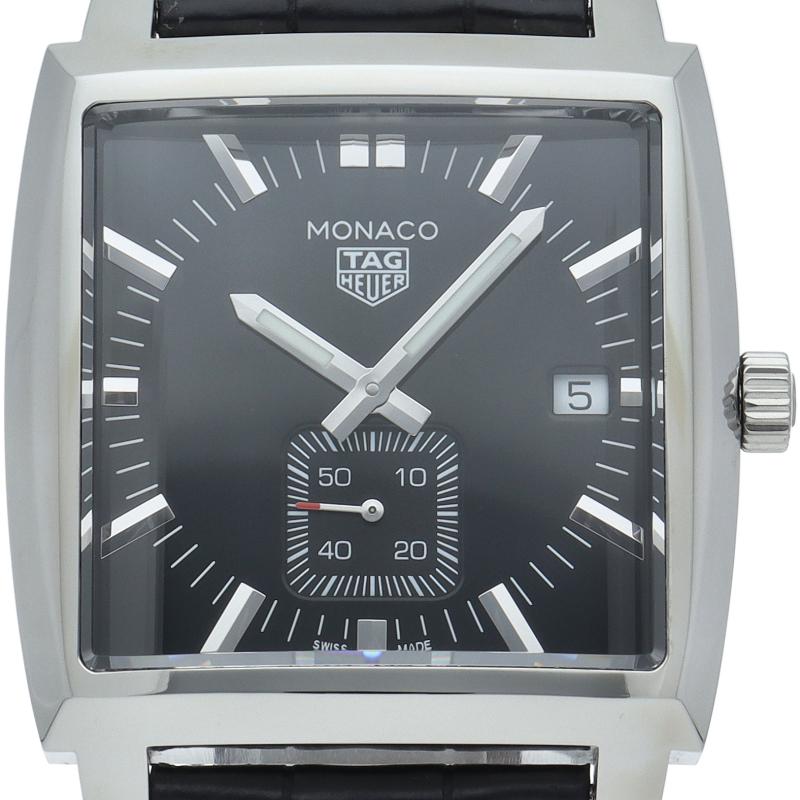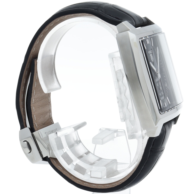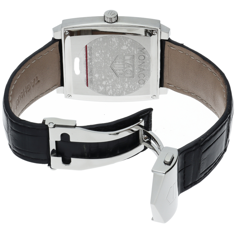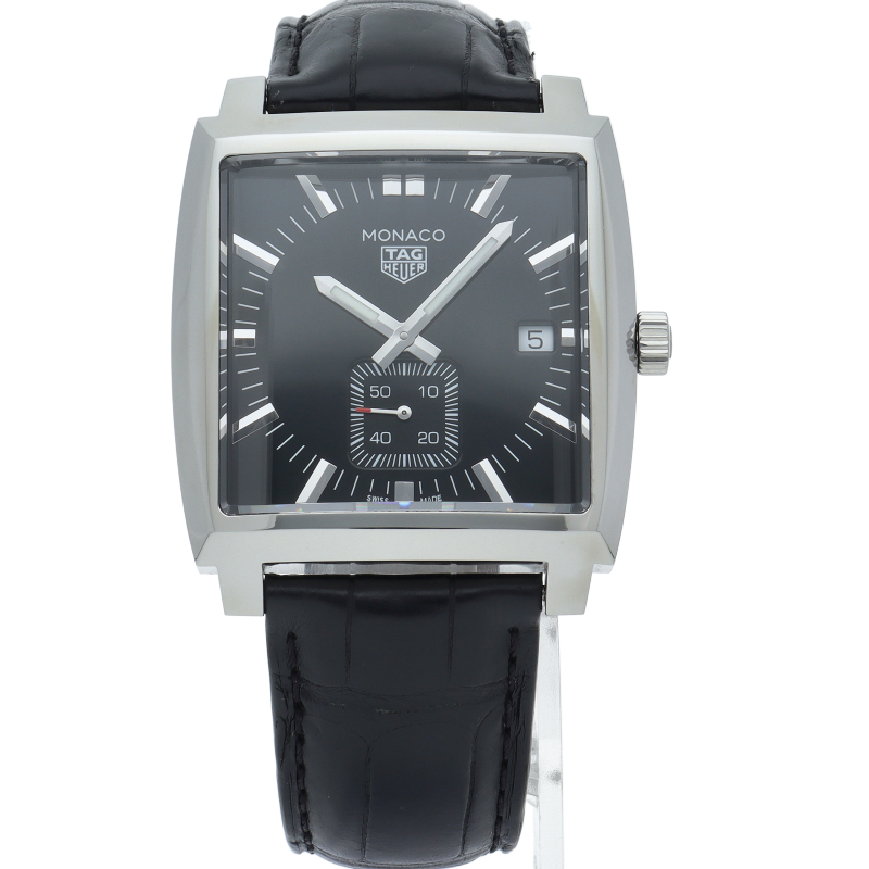 左右に膨らみを持たせた厚さ11ミリの37ミリ100m防水ケースレトロなモナコは、1971年公開の米国映画「栄光のル・マン」で主演のスティーブ・マックィーンが着用したことでも世界的に有名になったタグホイヤー人気の角形時計。クオーツムーブメントを搭載して6時のスモールセコンドに秒、3時の窓に日付を表示します。