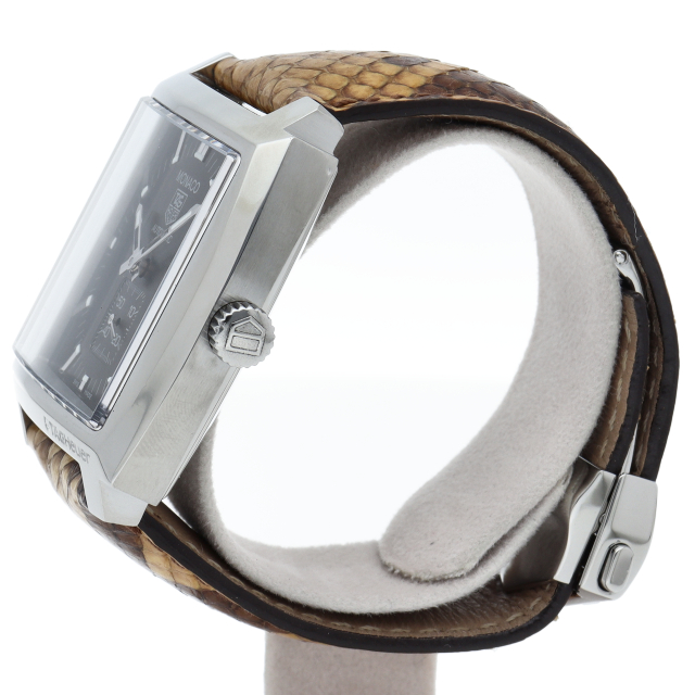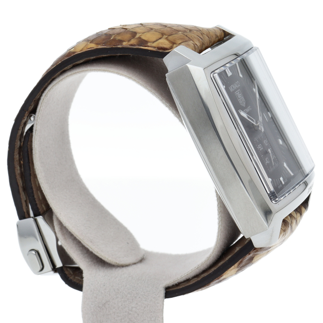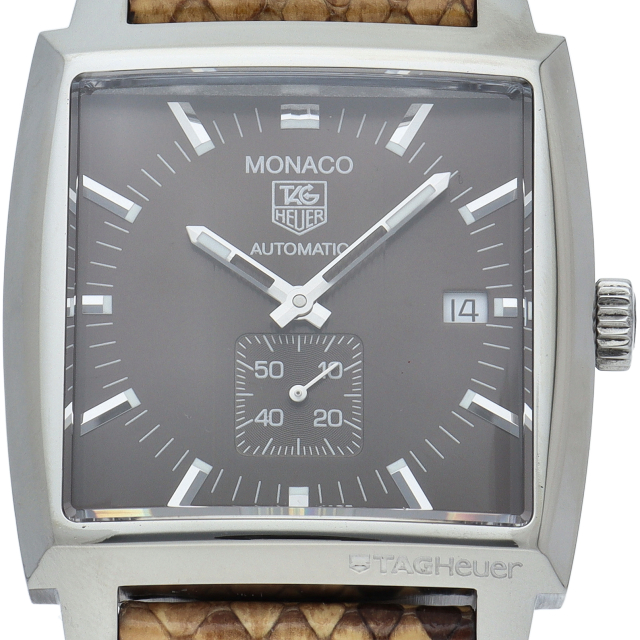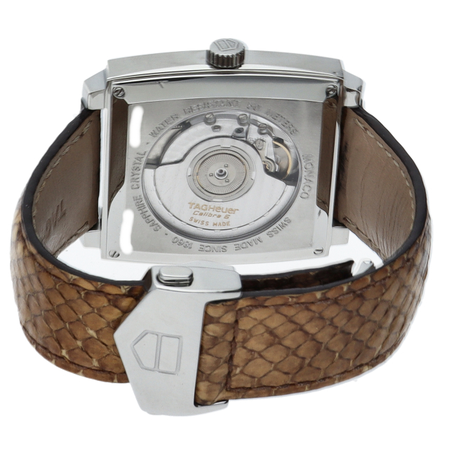 世界初の角型防水ケース時計を搭載したタグ・ホイヤーを代表するクラシックモデルがモナコです。モナコにはじめてサファイヤクリスタルの風防が搭載されたモデルです。6時位置にはスクエア形状のスモールセコンドを備えております。ケースバックからはタグ・ホイヤー製・キャリバー6の作動する様子が見られます。