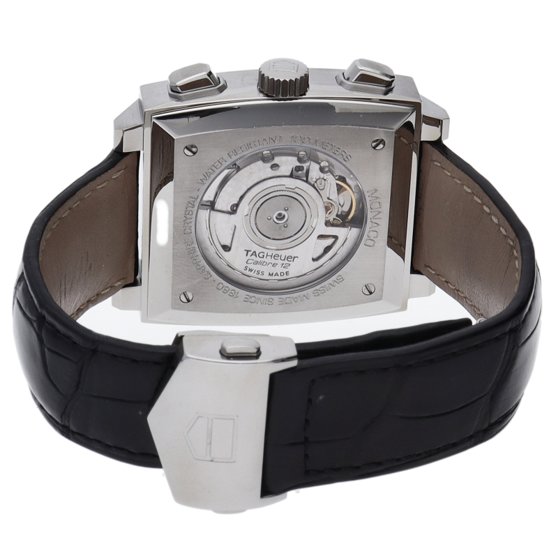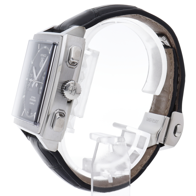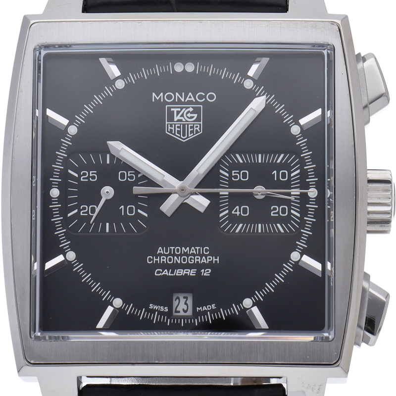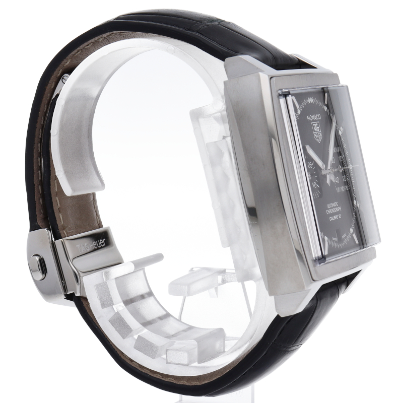 ブラックダイヤルがシックで美しい、モナコ誕生40周年記念モデルです。モナコ特有のスクエアケースにキャリバー12を搭載。風防の素材をプラスチックからサファイアへ進化し、防水性も100mへアップ。