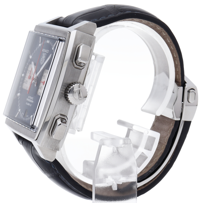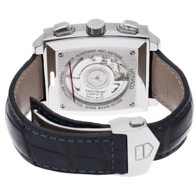 タグホイヤーの人気モデル「モナコ」誕生40周年記念モデル。ケース径が39mmに大型化され、プラスチック風防からサファイアガラスに変更、さらに、ケースバックは裏スケルトン仕様となりました。CAW2111-0。