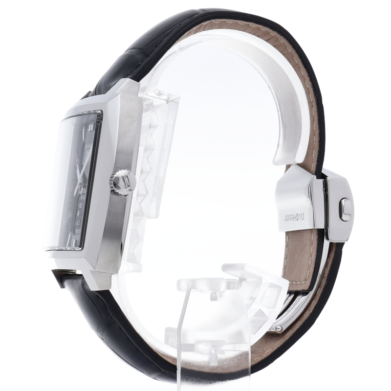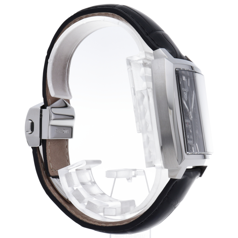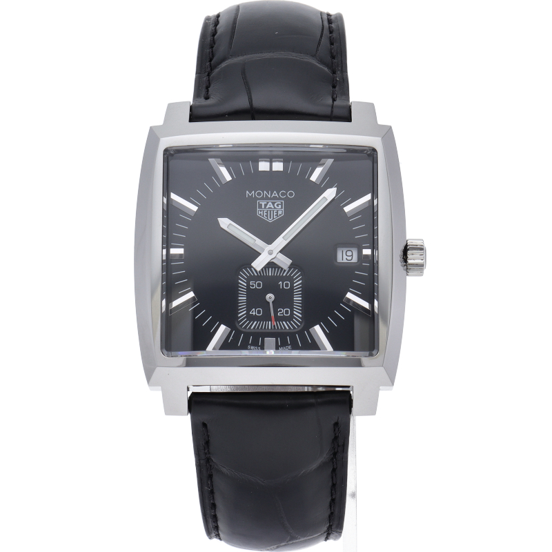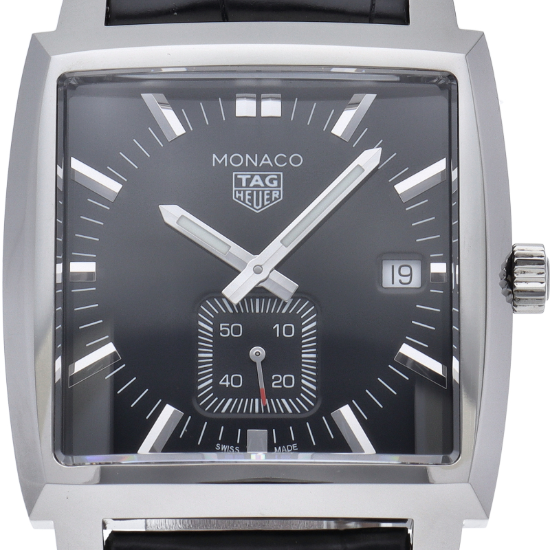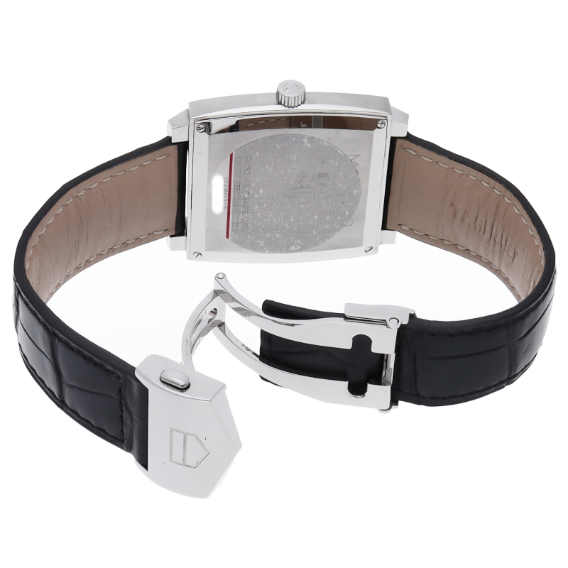 左右に膨らみを持たせた厚さ11ミリの37ミリ100m防水ケースレトロなモナコは、1971年公開の米国映画「栄光のル・マン」で主演のスティーブ・マックィーンが着用したことでも世界的に有名になったタグホイヤー人気の角形時計。クオーツムーブメントを搭載して6時のスモールセコンドに秒、3時の窓に日付を表示します。