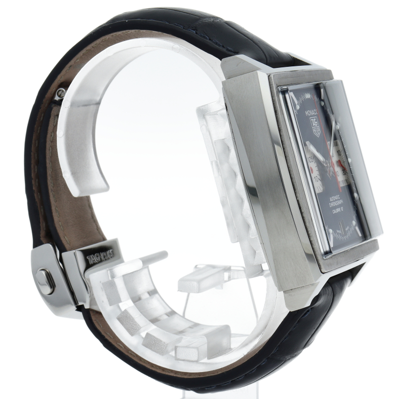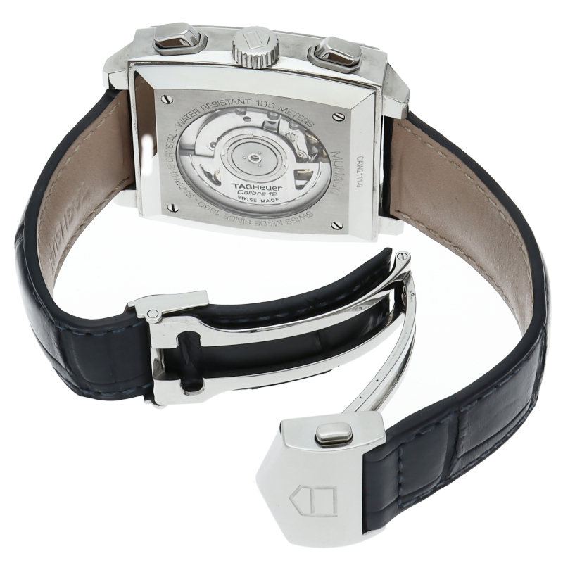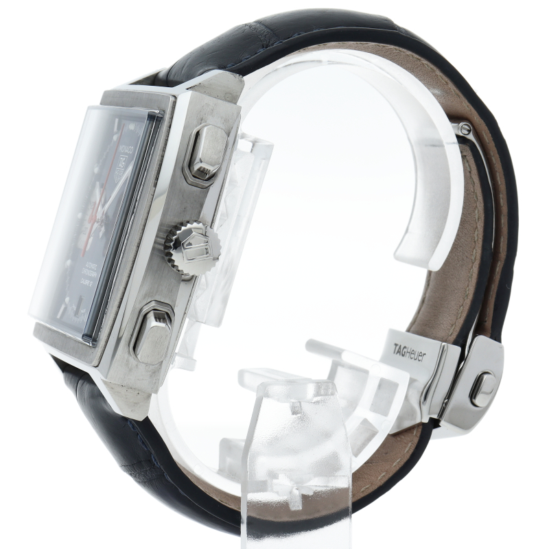 タグホイヤーの人気モデル「モナコ」誕生40周年記念モデル。ケース径が39mmに大型化され、プラスチック風防からサファイアガラスに変更、さらに、ケースバックは裏スケルトン仕様となりました。CAW2111-0。