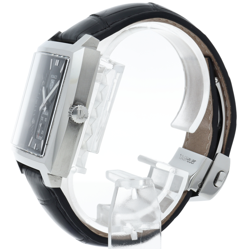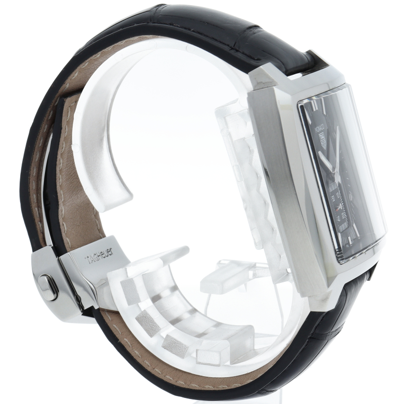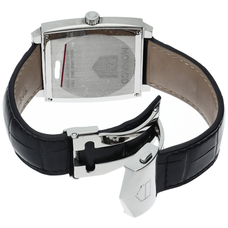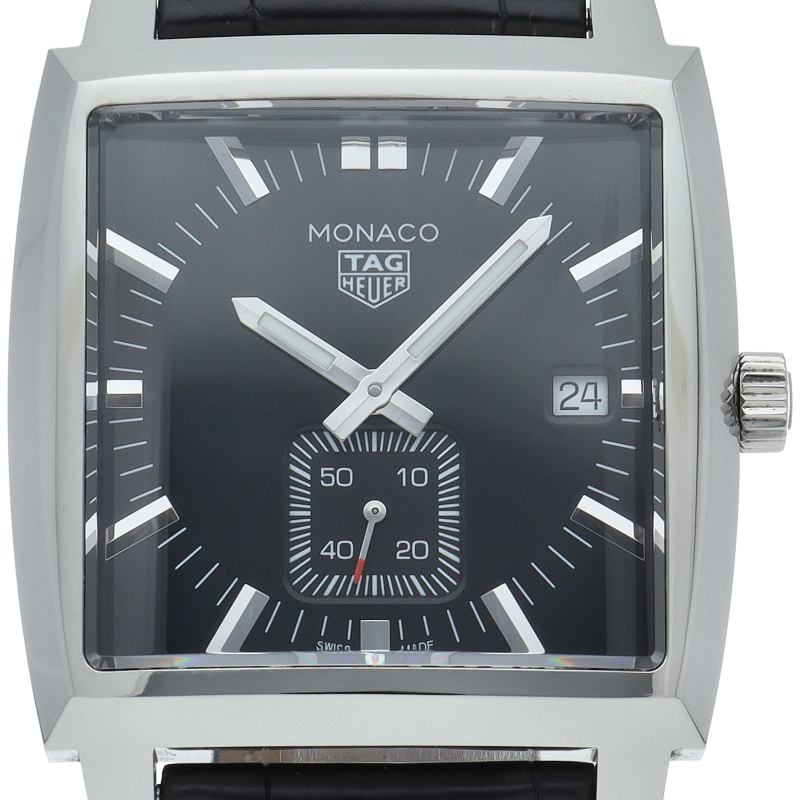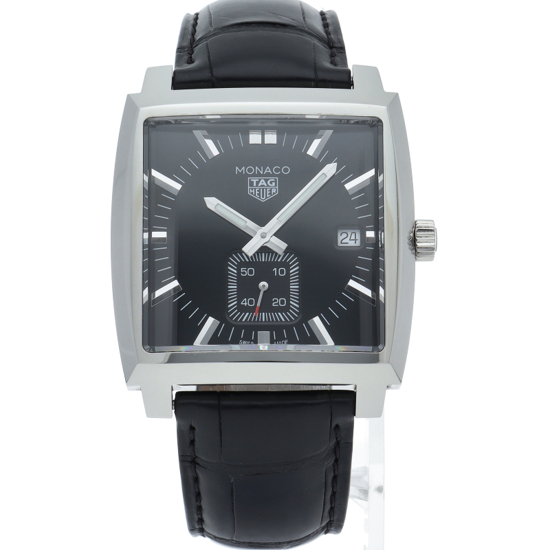 左右に膨らみを持たせた厚さ11ミリの37ミリ100m防水ケースレトロなモナコは、1971年公開の米国映画「栄光のル・マン」で主演のスティーブ・マックィーンが着用したことでも世界的に有名になったタグホイヤー人気の角形時計。クオーツムーブメントを搭載して6時のスモールセコンドに秒、3時の窓に日付を表示します。
