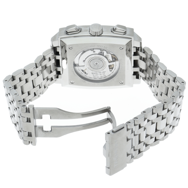 タグホイヤーの人気モデル「モナコ」誕生40周年記念モデル。ケース径が39mmに大型化され、プラスチック風防からサファイアガラスに変更、さらに、ケースバックは裏スケルトン仕様となりました。CAW2111-0。
