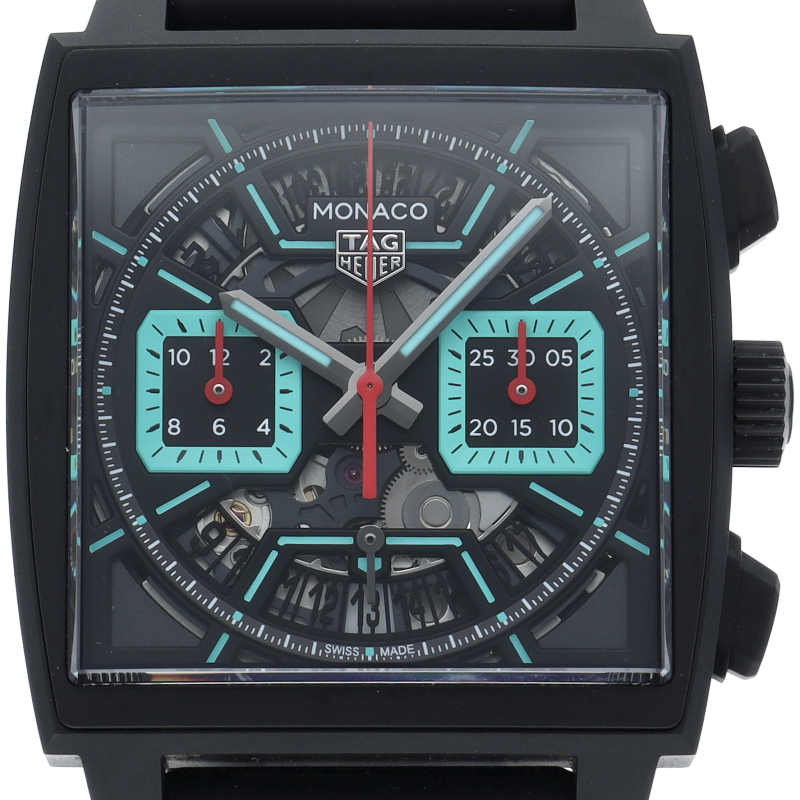 1969年の登場以来、タグホイヤーが掲げるスピリット「アバンギャルド」を発信し続ける「モナコ」。映画「栄光のル・マン」でスティーブ・マックィーンが着用したエピソードでも有名です。こちらは39mmのスクエアケースに、コラムホイール式80時間パワーリザーブの自社製自動巻きキャリバー「ホイヤー02」を搭載し、複雑なオープンワークダイヤルを初めて取り入れた2024年発売のモデルです。