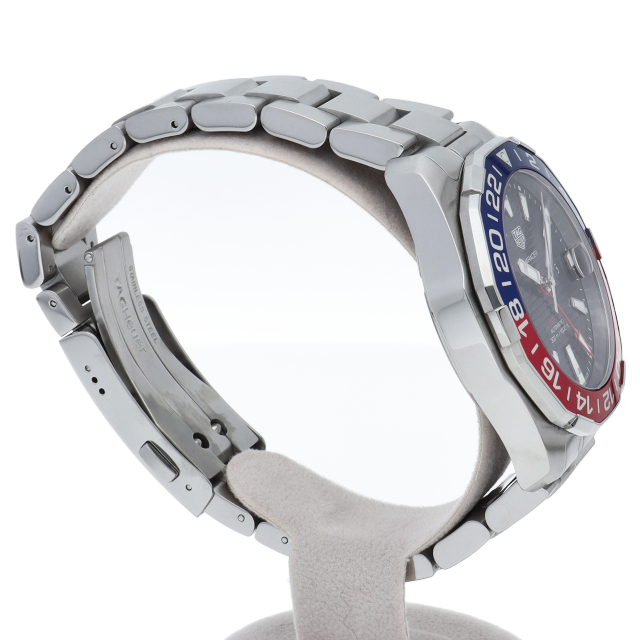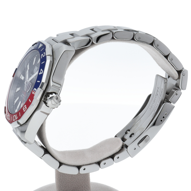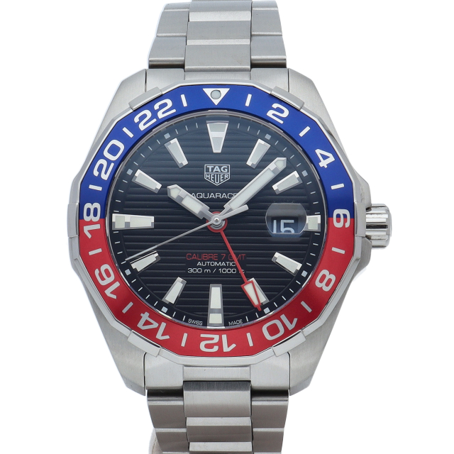 タグ・ホイヤーの人気スポーツウォッチシリーズ「アクアレーサー」。このキャリバー7GMT自動巻きモデルは、ブラックダイヤルに映える鮮やかなブルー&レッドベゼルが魅力。2色使いで昼夜がひと目で判別できるこの24時間計回転ベゼルとレッドのGMT針で2つ目の異なる国の時刻が読み取れて海外でのダイビングにも重宝します。