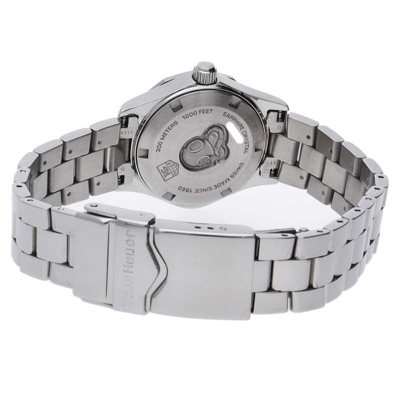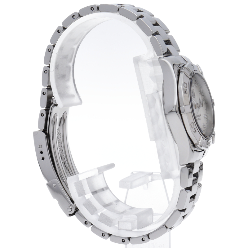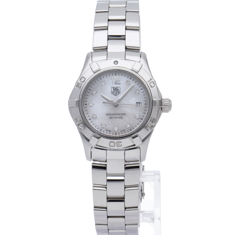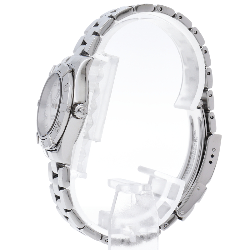 「アクアレーサー」のレディースモデルです。ホワイトシェルの文字盤に10ポイントダイヤモンドがとても可愛らしく、高級感を演出しています。回転式ベゼル。30気圧(水深300M)防水性能を備えたレディースウォッチでも数少ないスポーツモデルです。