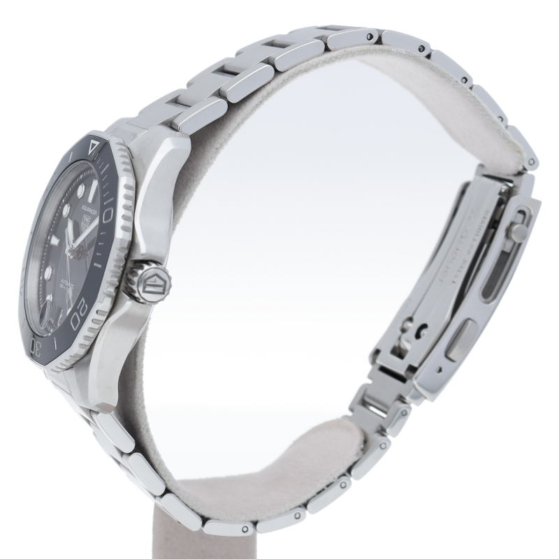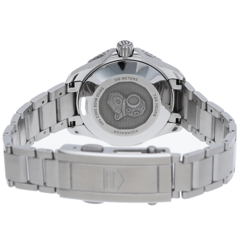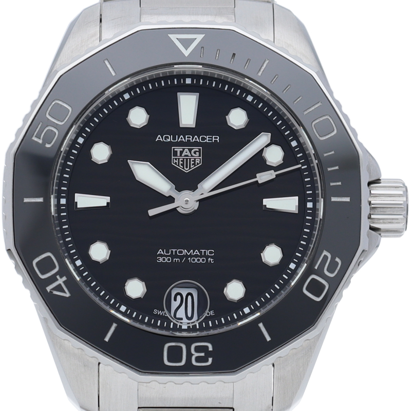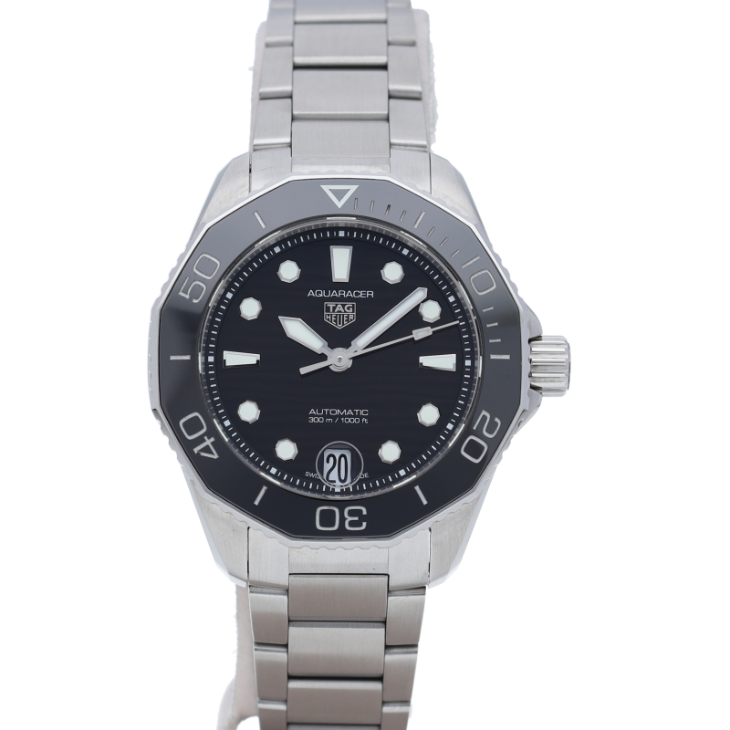 深海潜水のプロフェッショナルツール この新しいタグ・ホイヤー アクアレーサーは、自動巻機械式ムーブメント、キャリバー5を搭載。波模様の仕上げが施されたブラックのダイヤルを備えています。スリムなケースに、ダブルセーフティクラスプが付いたステンレススティール製ブレスレットが合わせられ、様々な動きにも対応するフィット感を実現しています。