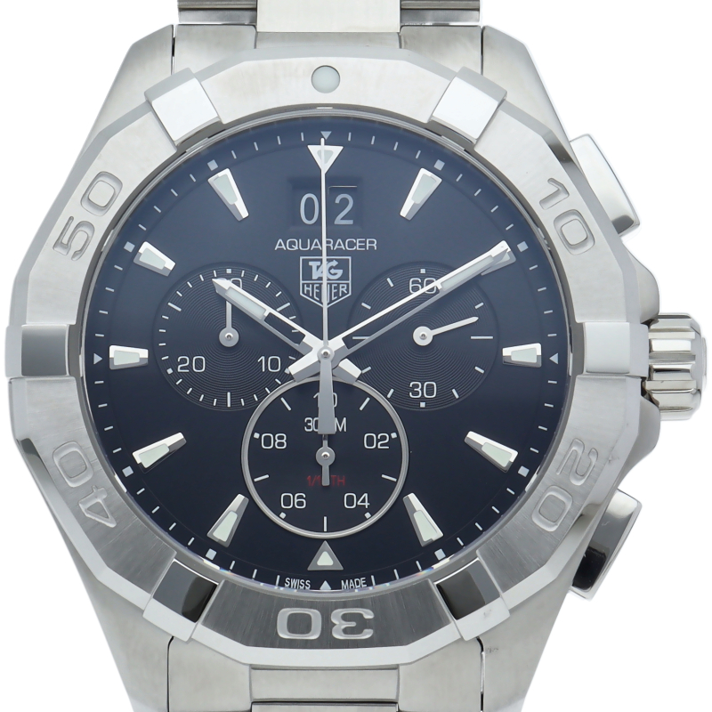43ミリの大型のケースで主張が強くなったアクアレーサー。12時に配置されたビックデイトや十分の一まで計測可能なクロノグラフ機能が付いた実用性の高い一本です。