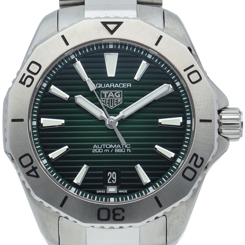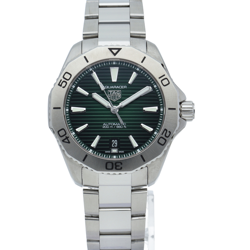 深いグリーンのサンレイ加工サテン仕上げのダイヤルに、ステンレススティール製の超堅牢なデザインを合わせた、アドレナリンを刺激するタグ・ホイヤー アクアレーサー プロフェッショナル200。未知なる領域に足を踏み入れる冒険心をサポートします。限界を押し広げる、汎用性に優れたツールです。