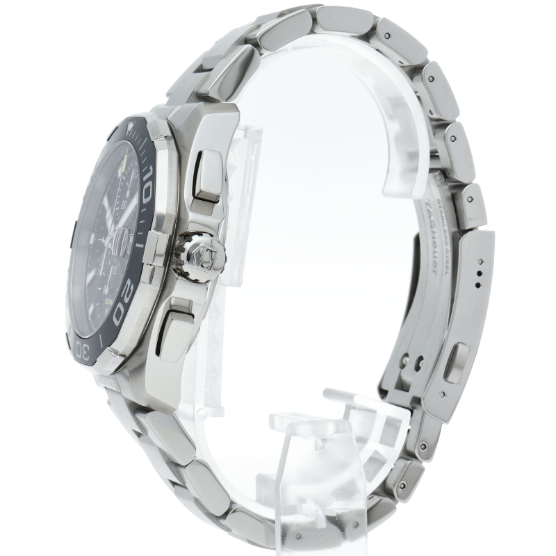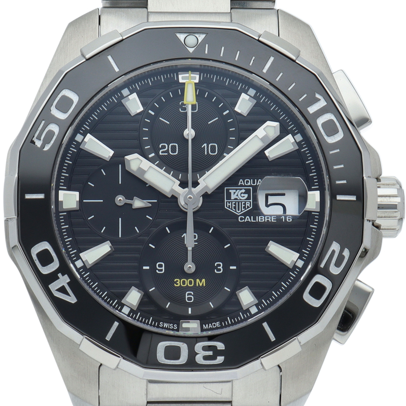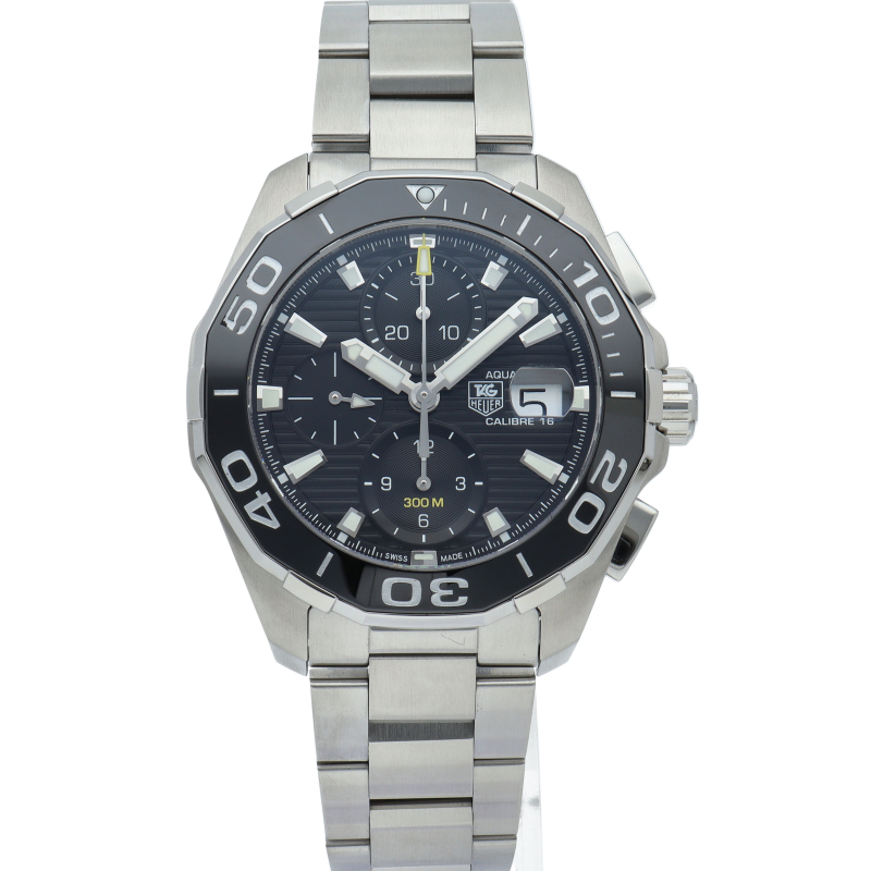 タグ・ホイヤーの人気スポーツウォッチシリーズ「アクアレーサー」。シンプルなデザインで仕上げられた高機能時計です。ブラックセラミックベゼル仕様。クロノグラフ機能搭載。