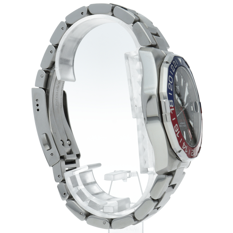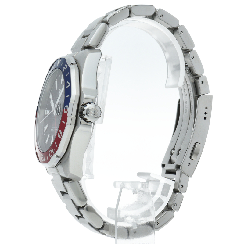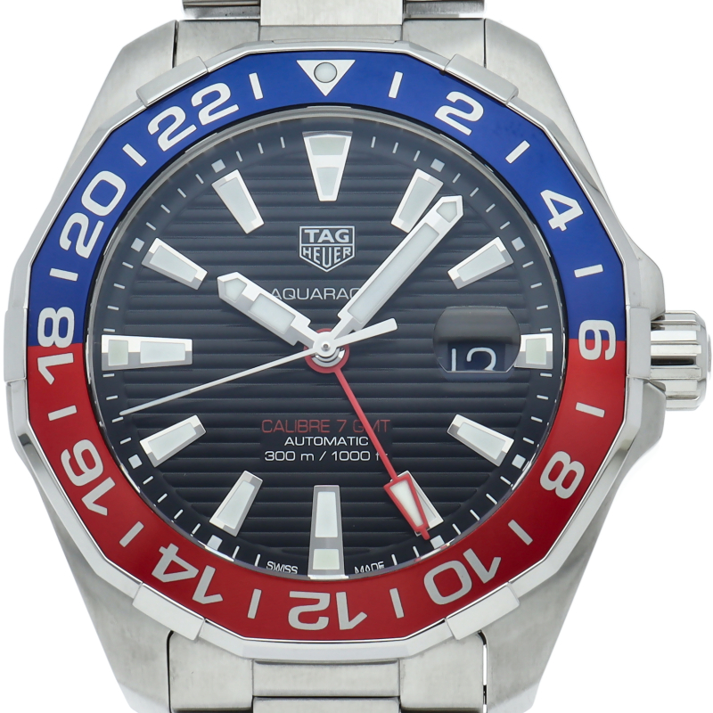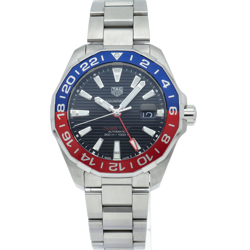 タグ・ホイヤーの人気スポーツウォッチシリーズ「アクアレーサー」。このキャリバー7GMT自動巻きモデルは、ブラックダイヤルに映える鮮やかなブルー&レッドベゼルが魅力。2色使いで昼夜がひと目で判別できるこの24時間計回転ベゼルとレッドのGMT針で2つ目の異なる国の時刻が読み取れて海外でのダイビングにも重宝します。