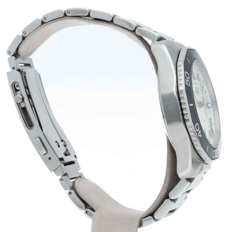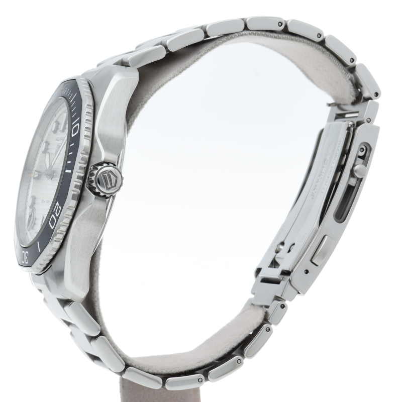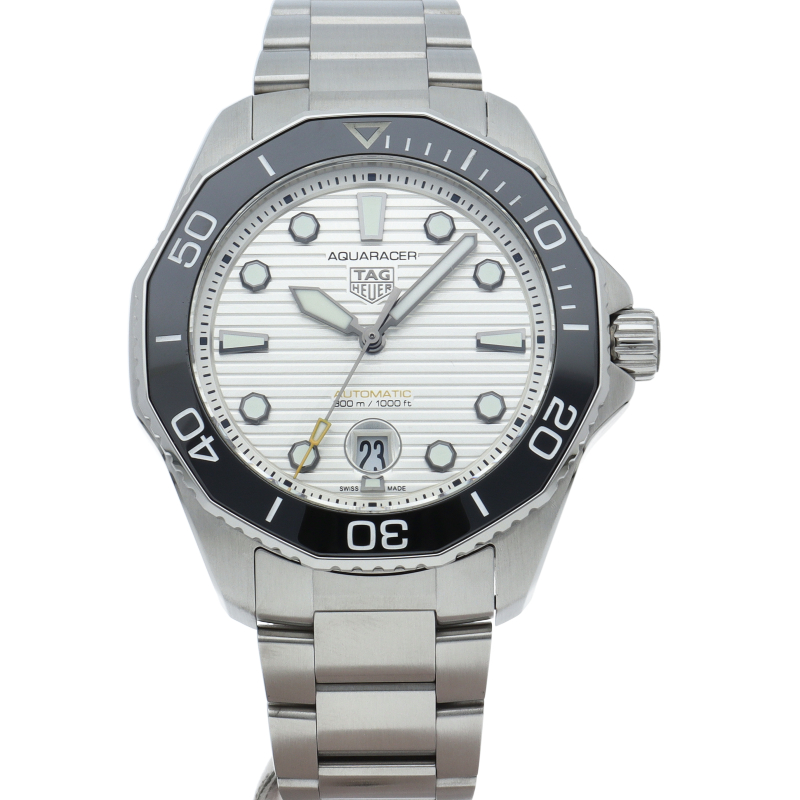 鮮やかなシルバーサンレイ仕上げのダイヤルを備えるタグホイヤー アクアレーサー プロフェッショナル300は、真のダイバーズウォッチ。ホワイトのスーパールミノバがコーティングされた大胆なブラックゴールドプレートの針とアワーマーカーが確かな視認性を約束します。