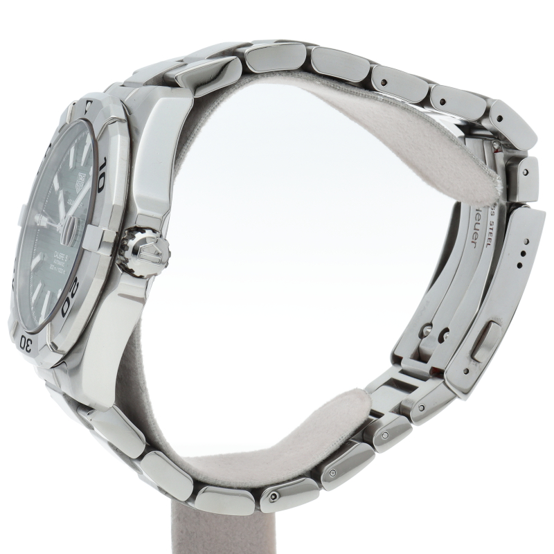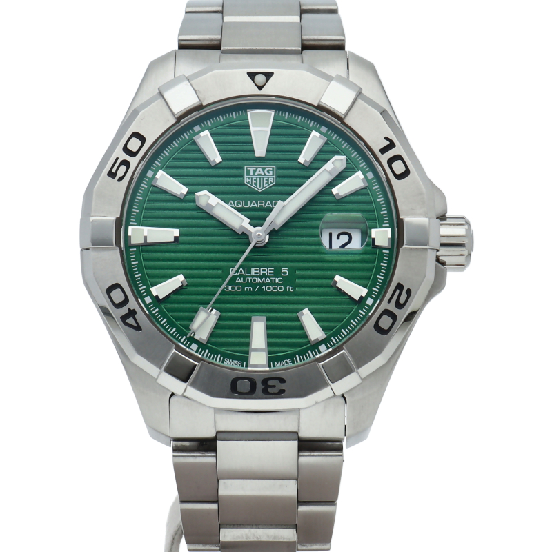 タグホイヤーの人気ダイバーズウォッチ「アクアレーサー」。光の加減により表情が変化するサンレイ加工が施されたグリーンの文字盤と、43mmの大きめのケースがインパクトのある人気のダイバーウォッチです。