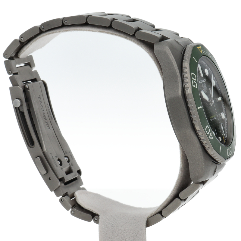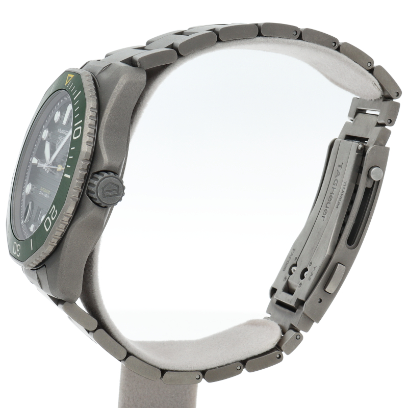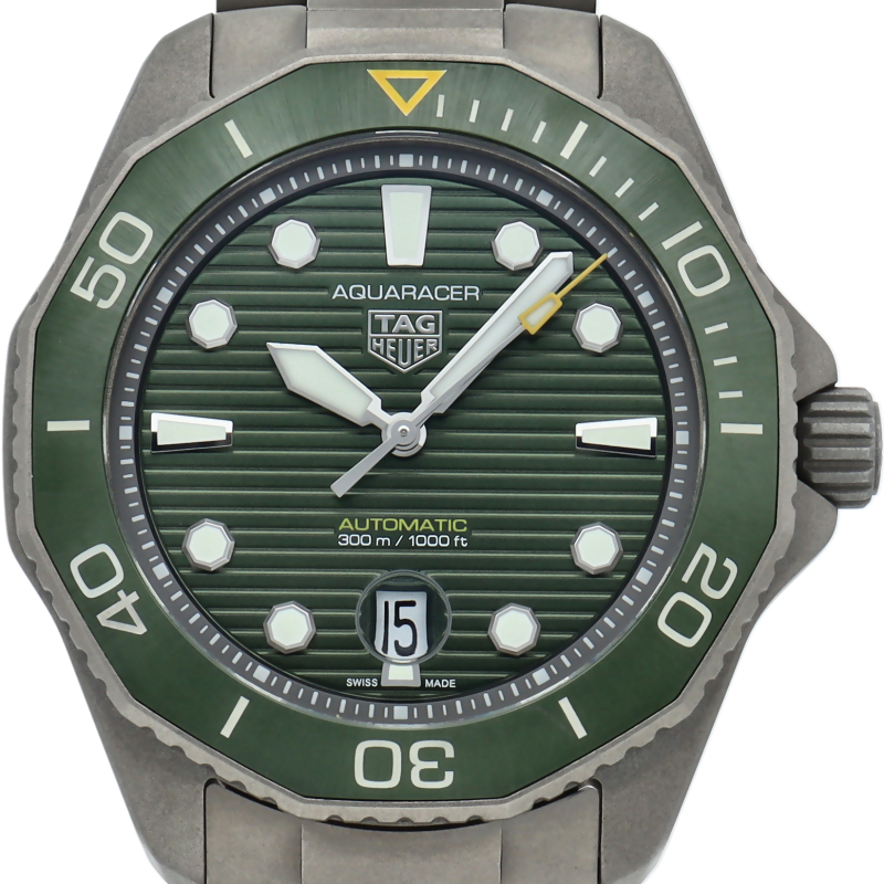 プロフェッショナルなダイバーズウォッチ、タグ・ホイヤー アクアレーサー プロフェッショナル300。サンレイ加工サテン仕上げのグリーンのダイヤルを備え、美しいデザインと究極の機能性を併せ持つラグジュアリーツールウォッチです。自動巻機械式ムーブメント キャリバー5が搭載された43mmのケースには、防水性とあらゆる状況に対応する機能性が備わっています。