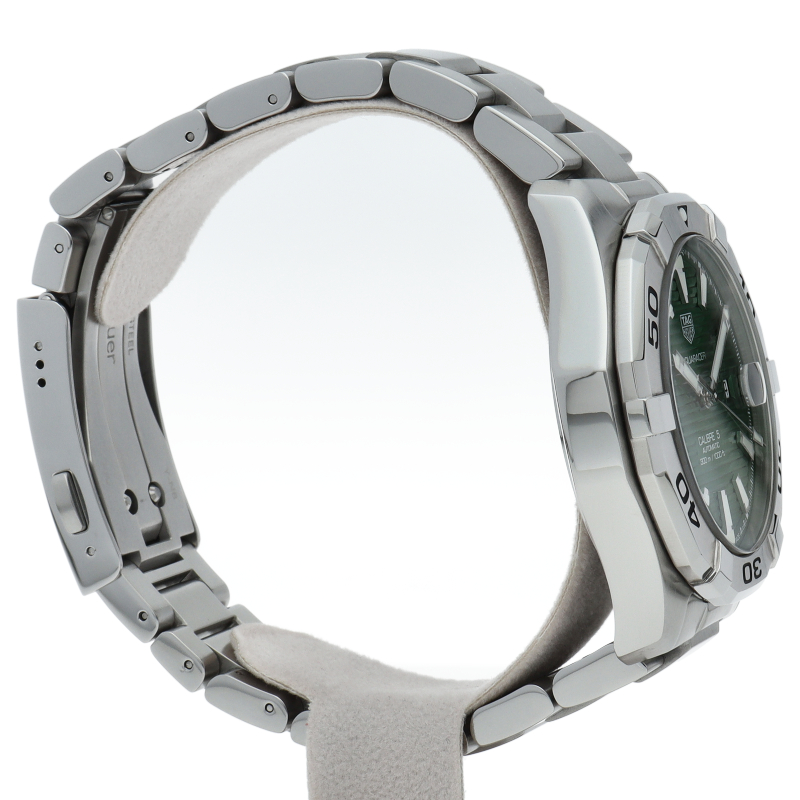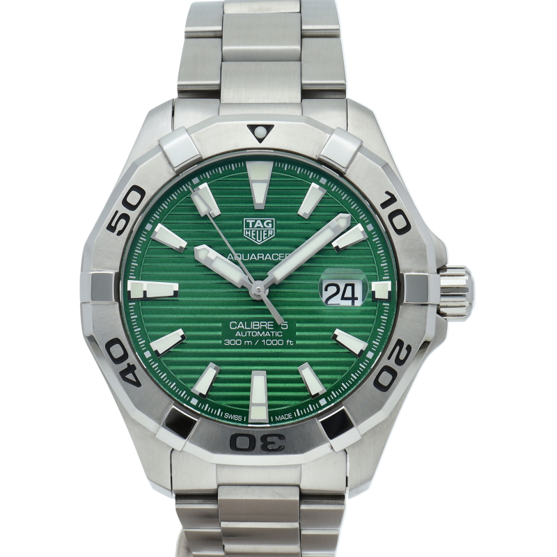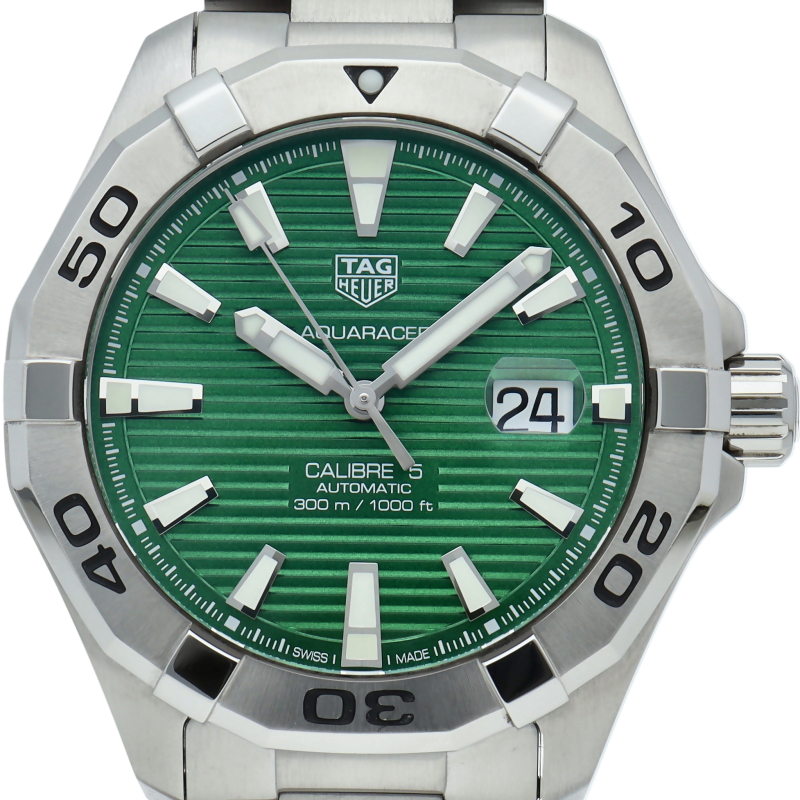 タグホイヤーの人気ダイバーズウォッチ「アクアレーサー」。光の加減により表情が変化するサンレイ加工が施されたグリーンの文字盤と、43mmの大きめのケースがインパクトのある人気のダイバーウォッチです。