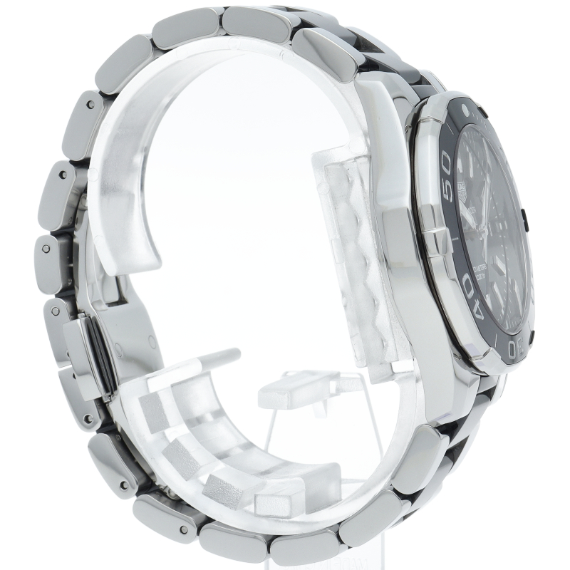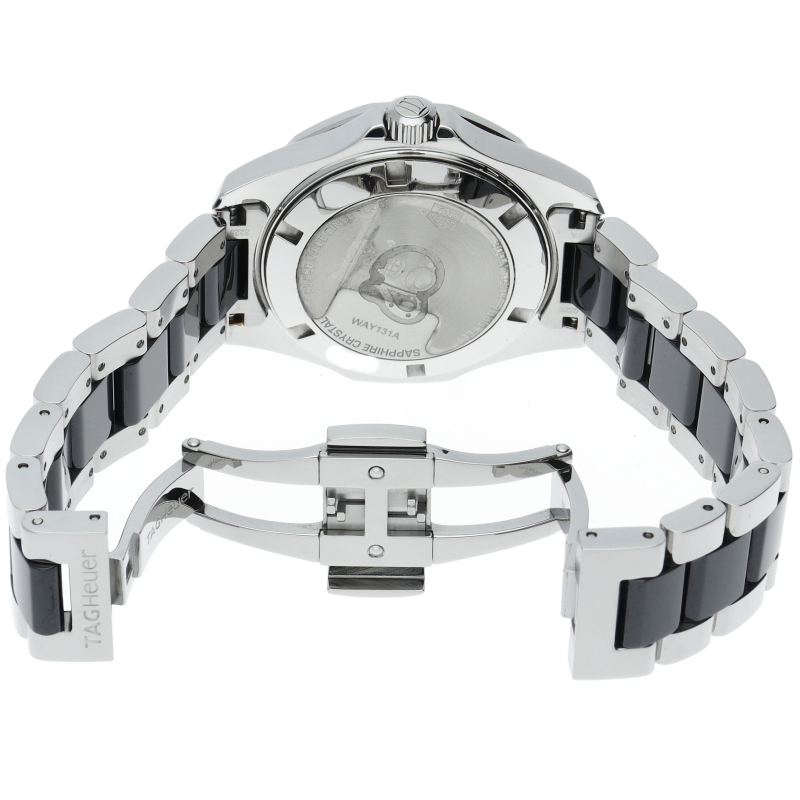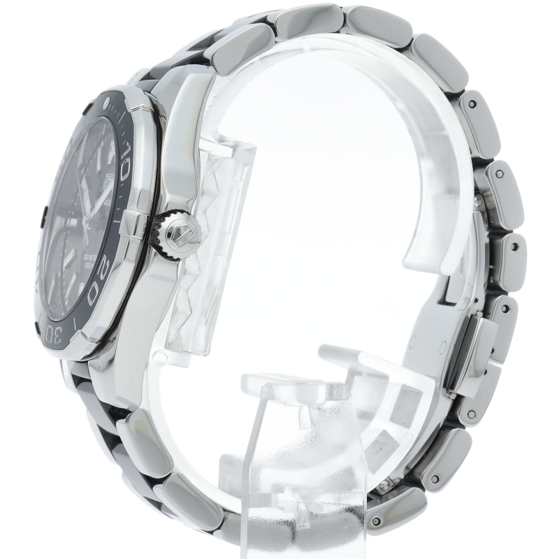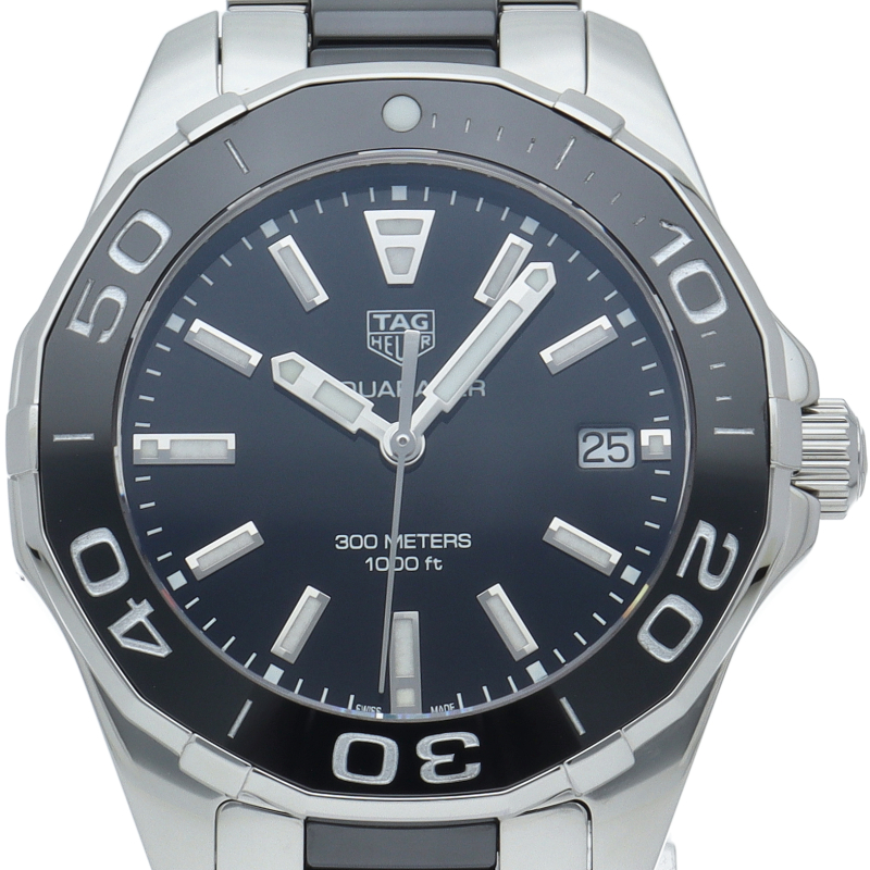 タグホイヤーのアクアレーサーです。 こちらは2016年に発表されたステンレスとセラミックを素材に使用したモデルです。スポーティーなモデルですが、ベゼルに施されたダイヤモンドが女性向けのデザインに仕上がっております。300Mの高い防水性も備えており、実用面でも優れたモデルです。