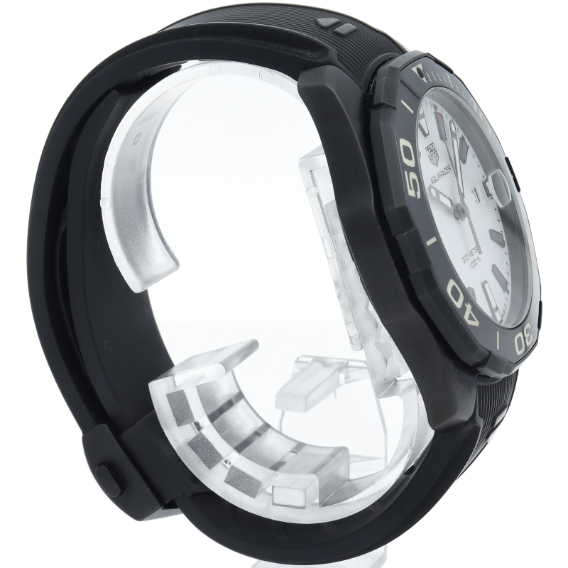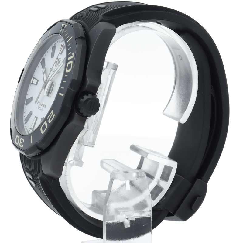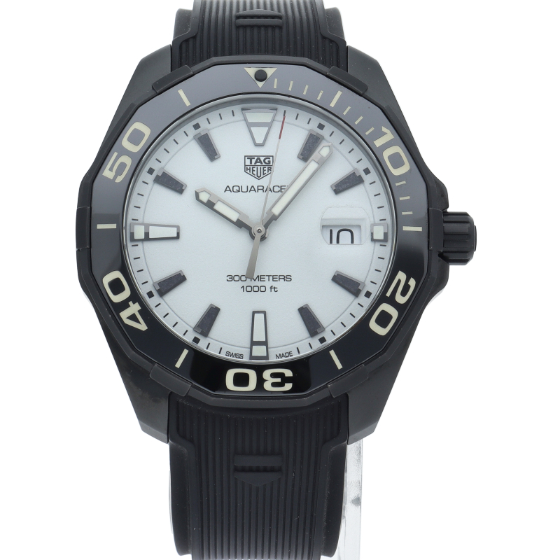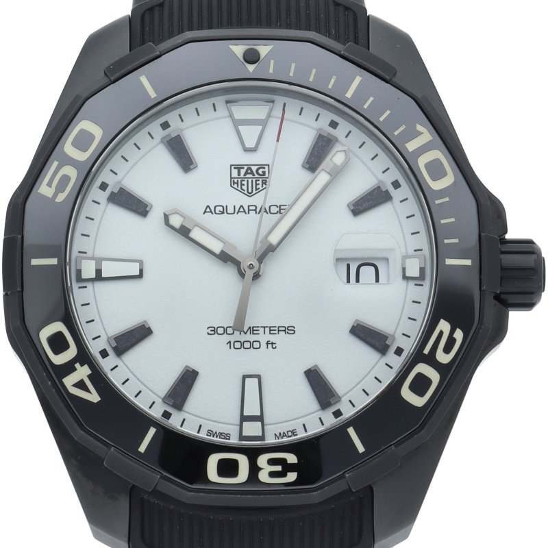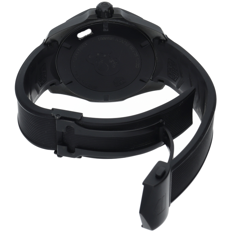 タグホイヤーの人気ダイバーズウォッチ“アクアレーサー”。こちらのモデルはチタンケースにブラックPVD加工が施されており、ケースは艶やかで非常に軽量なのが印象的です。また、インデックスのみならず、文字盤自体が夜光になっており、暗闇でも抜群の視認性を誇る、まさに「ナイトダイバー」という名に相応しいモデルです。