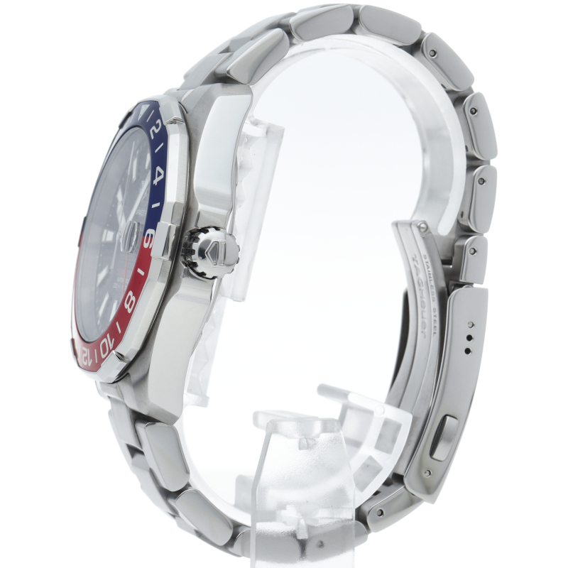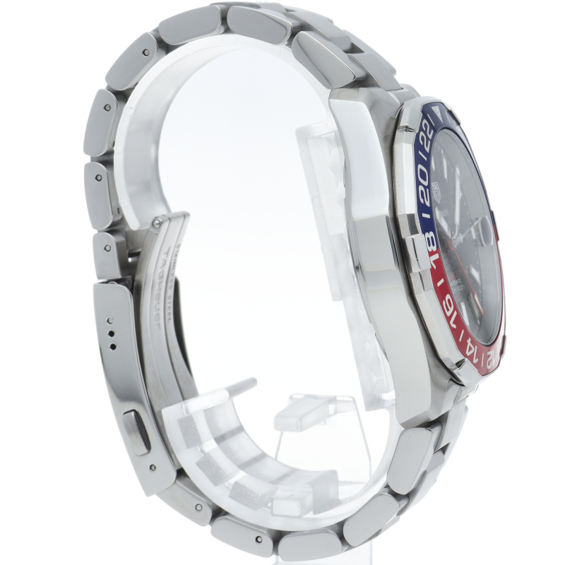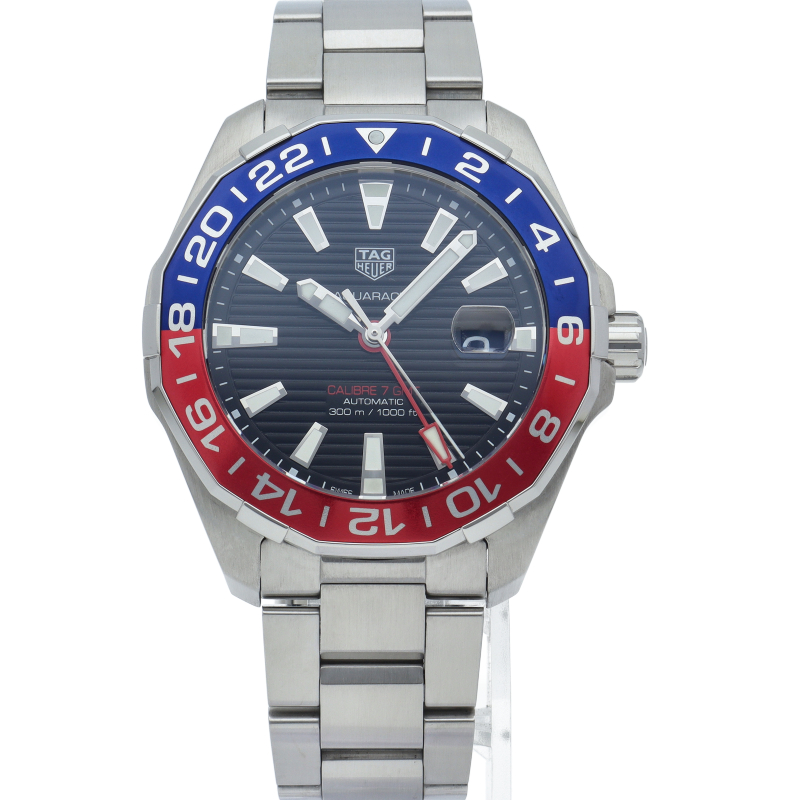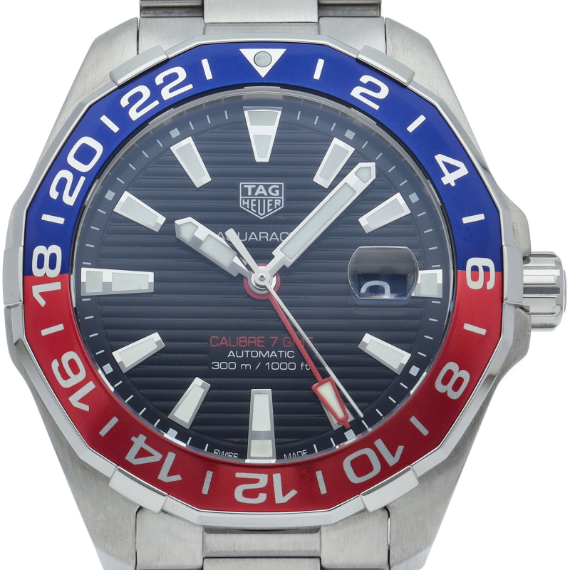 タグ・ホイヤーの人気スポーツウォッチシリーズ「アクアレーサー」。このキャリバー7GMT自動巻きモデルは、ブラックダイヤルに映える鮮やかなブルー&レッドベゼルが魅力。2色使いで昼夜がひと目で判別できるこの24時間計回転ベゼルとレッドのGMT針で2つ目の異なる国の時刻が読み取れて海外でのダイビングにも重宝します。
