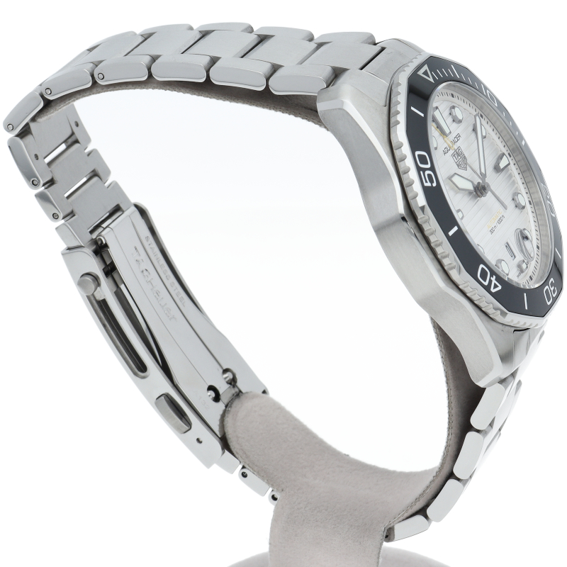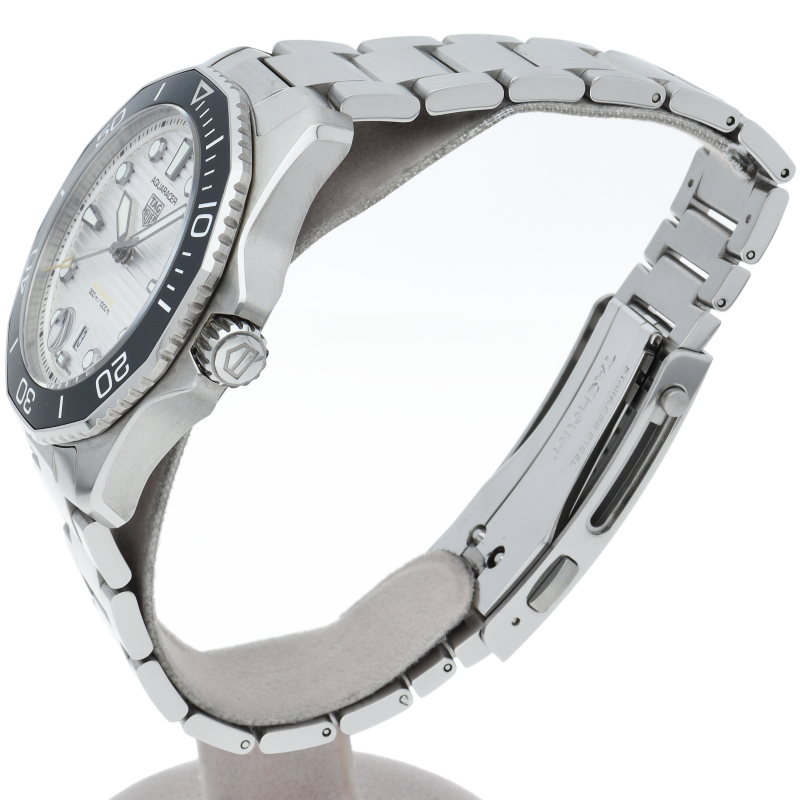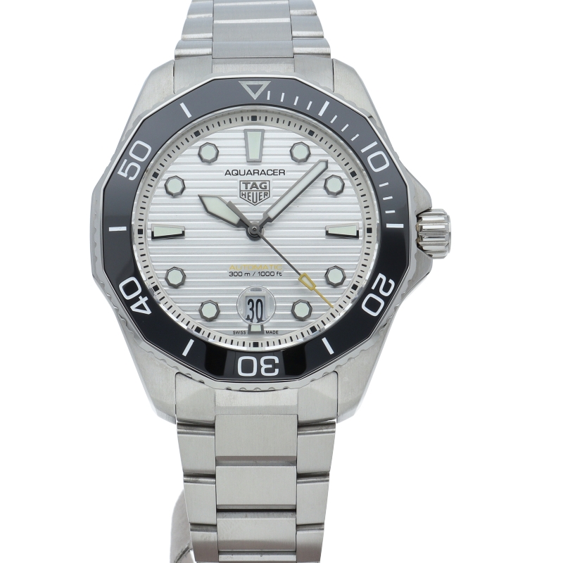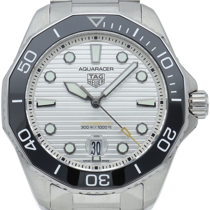 鮮やかなシルバーサンレイ仕上げのダイヤルを備えるタグホイヤー アクアレーサー プロフェッショナル300は、真のダイバーズウォッチ。ホワイトのスーパールミノバがコーティングされた大胆なブラックゴールドプレートの針とアワーマーカーが確かな視認性を約束します。