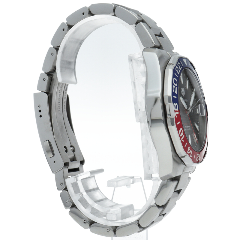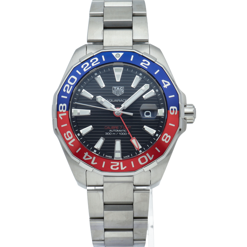 タグ・ホイヤーの人気スポーツウォッチシリーズ「アクアレーサー」。このキャリバー7GMT自動巻きモデルは、ブラックダイヤルに映える鮮やかなブルー&レッドベゼルが魅力。2色使いで昼夜がひと目で判別できるこの24時間計回転ベゼルとレッドのGMT針で2つ目の異なる国の時刻が読み取れて海外でのダイビングにも重宝します。