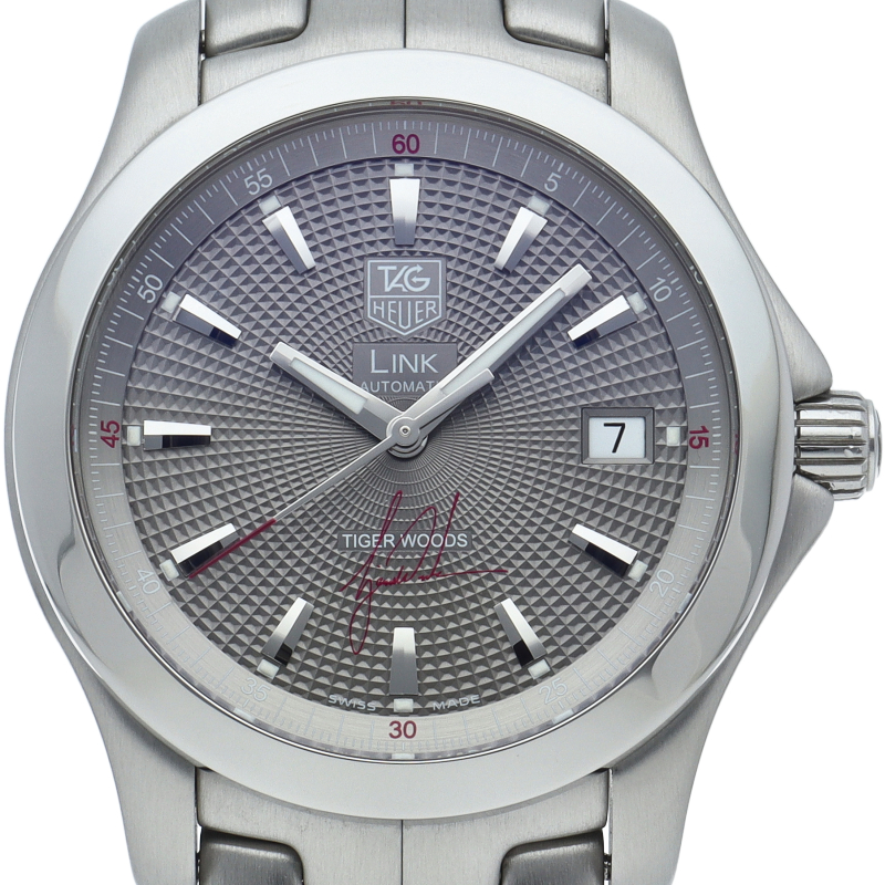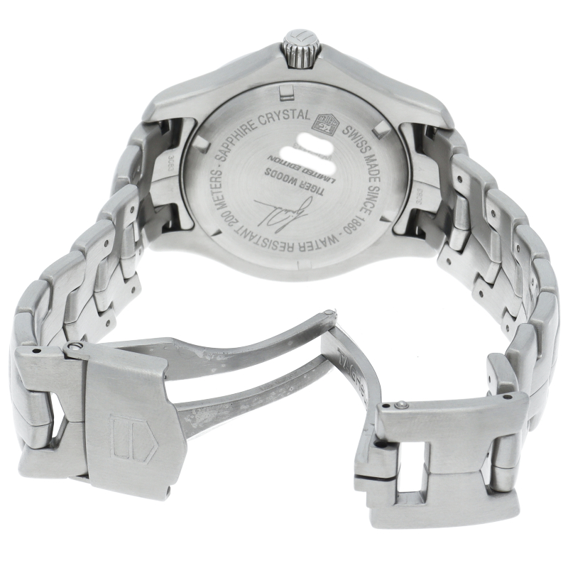「Sシェイプ」と呼ばれる独特のラインでデザインされたブレスレットがオリジナリティ溢れる仕上がりになっているリンク。昔からタグホイヤーを代表ずるコレクションとしてリリースされています。5500本限定で作られたタイガーウッズモデルはギョウシェ彫りが施されたダイヤルの6時位置にタイガーウッズのサインがデザインされています。