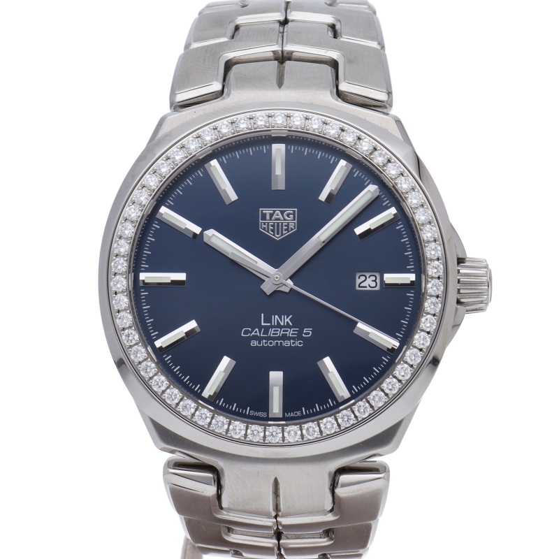 カレラ、モナコに並ぶタグホイヤー定番モデル「リンク」。快適さとエレガンスの融ブルーの3針モデルにダイヤモンドを配した、美しさ際立つモデル。人間工学に基づいて設計されたS字型ブレスレットにより、快適な着け心地を誇る。