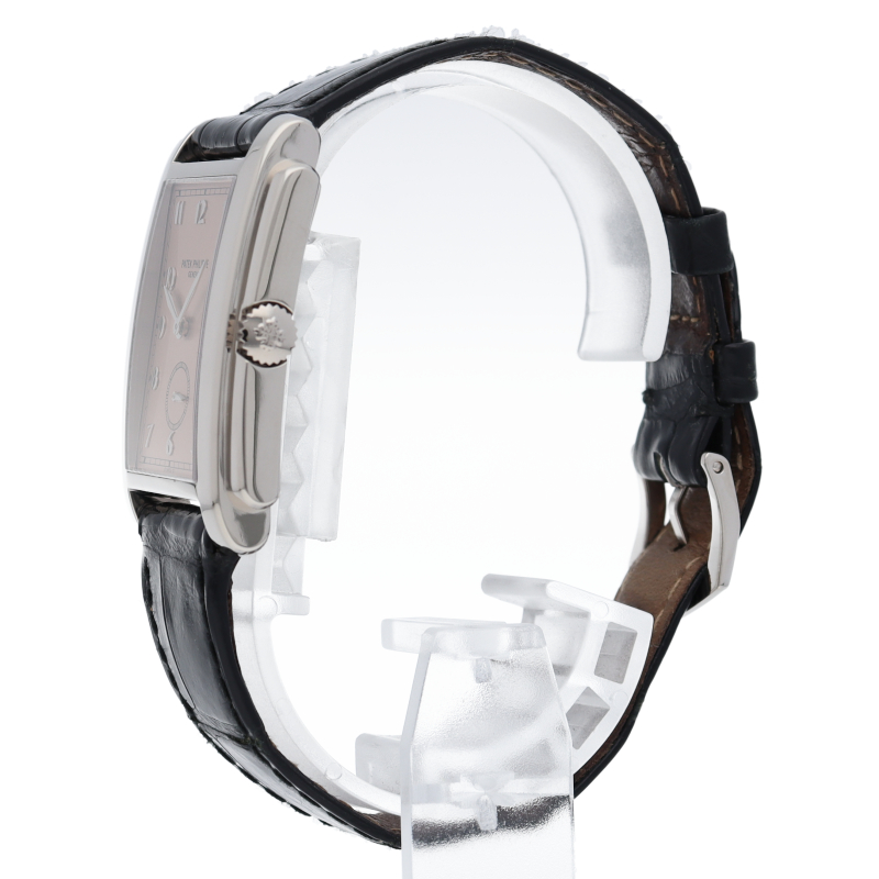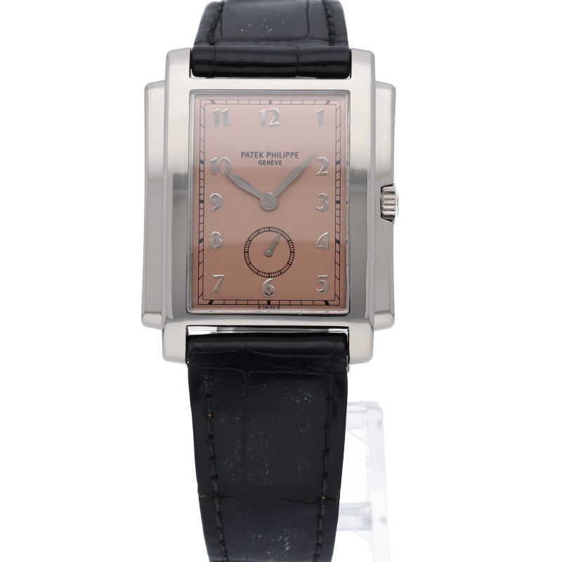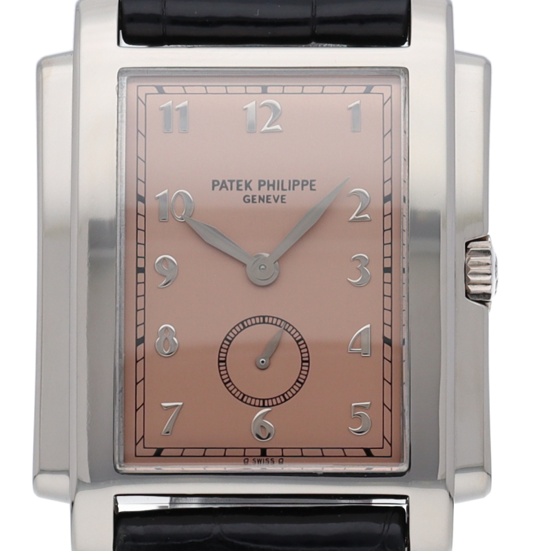 アールデコ様式を取り入れた、クラシカルなレクタンギュラーウォッチ「5024G-001」。カッパーピンクの文字盤には、「SWISS」表記の両脇にシグママークがプリントされており、ゴールドを使用した特別な文字盤であることを証明します。シンプルなデザインと小振りなサイズは、冠婚葬祭でも着用できる品格があり、世界最高峰のウォッチメゾン「パテックフィリップ」の品質を体感できる1本です。