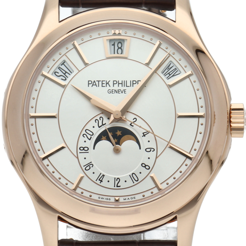 パテック フィリップ「アニュアルカレンダー」(5205R-001)。18Kローズゴールドの艶やかなケースに、オパリンホワイト文字盤が美しく調和します。上部に配置された3つの窓による暦表示が機能的かつモダンな印象。側面が窪んだ独創的なラグ形状が特徴で、雲上ブランドならではの気品と革新的なデザインが融合した至高のタイムピースです。