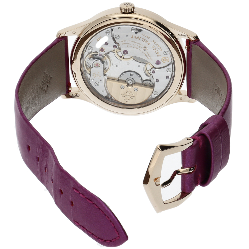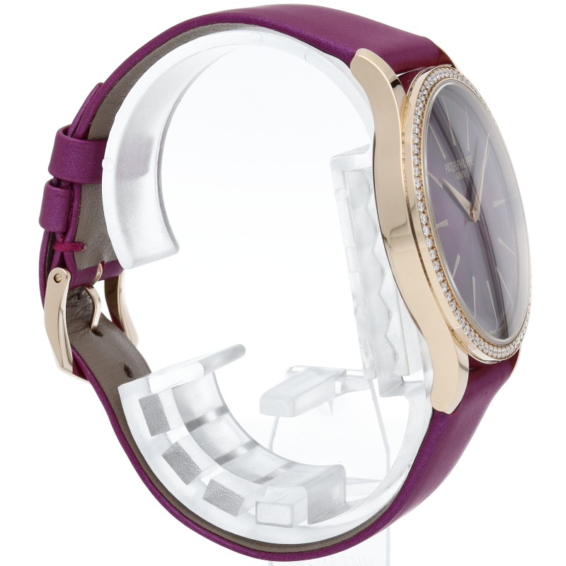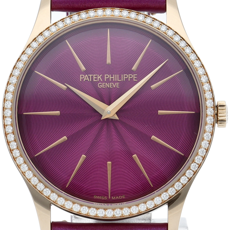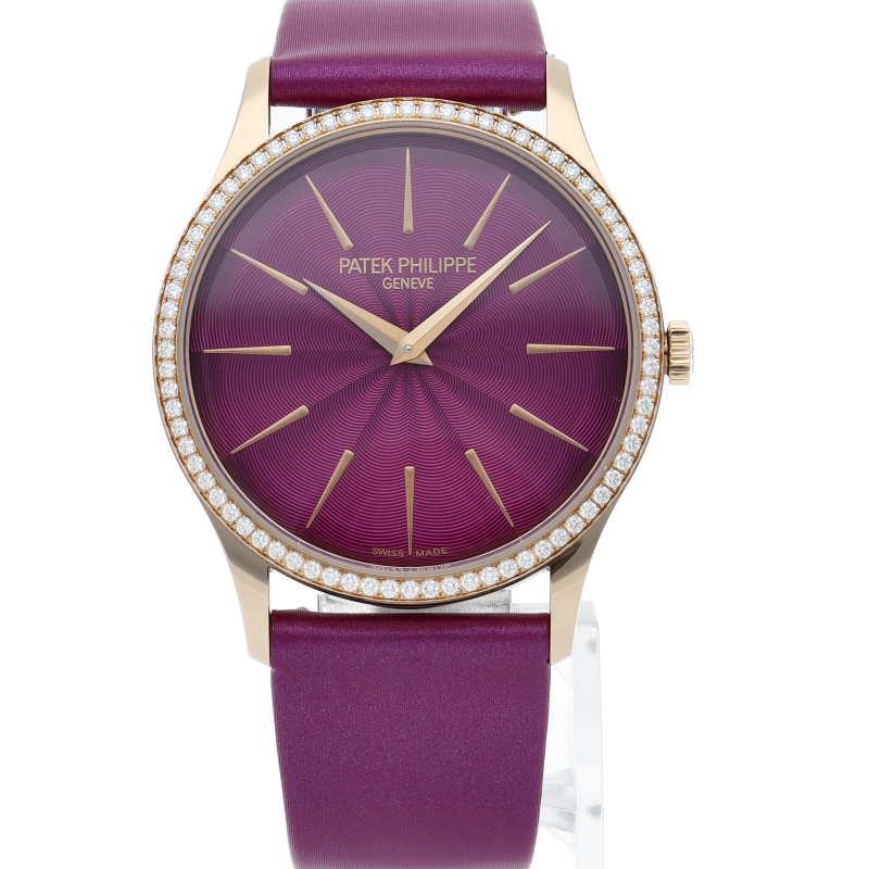 ローズゴールドのケースとダイヤモンド付ベゼルの温かみのあるニュアンスに完璧にマッチする、オリジナルで洗練されたカラー、パープルで装われた、自動巻カラトラバ4997モデルの新しいバージョンです。