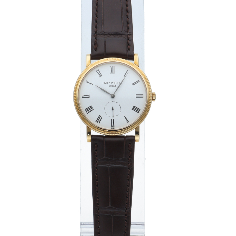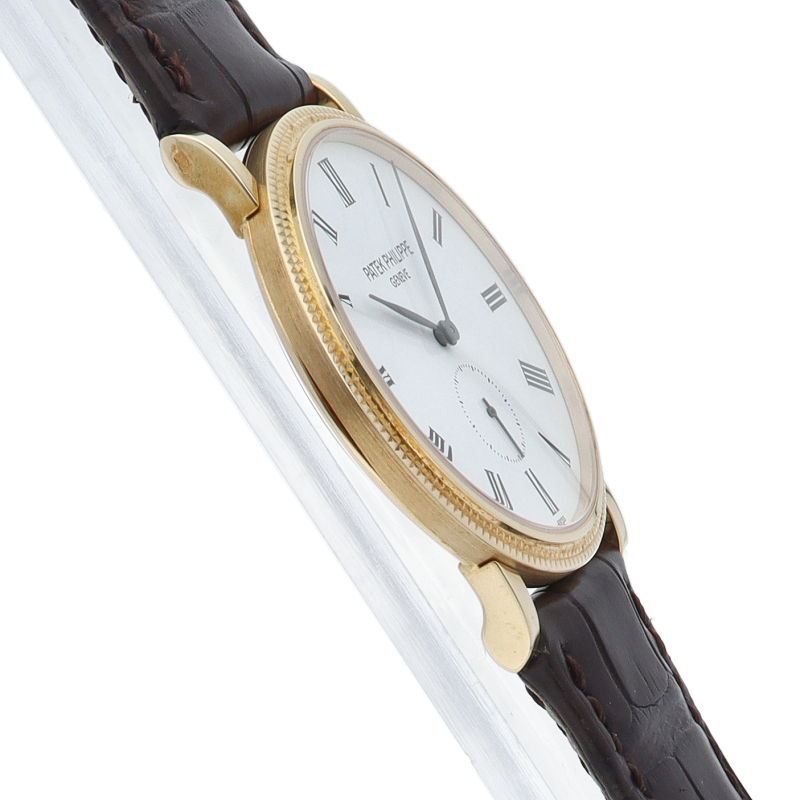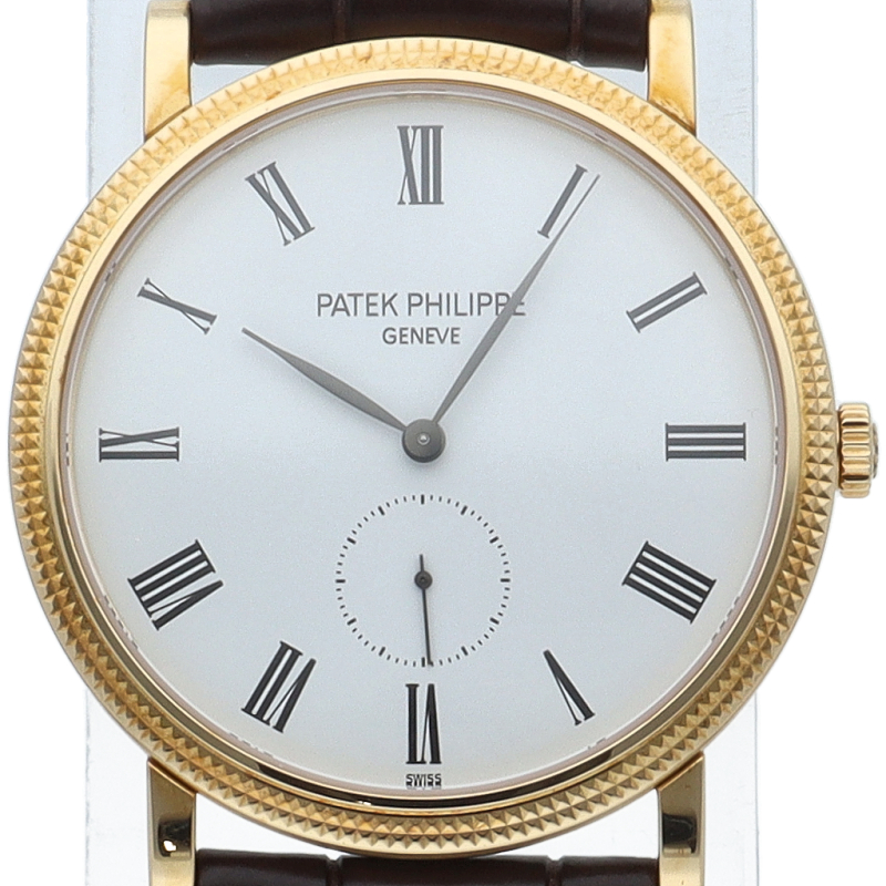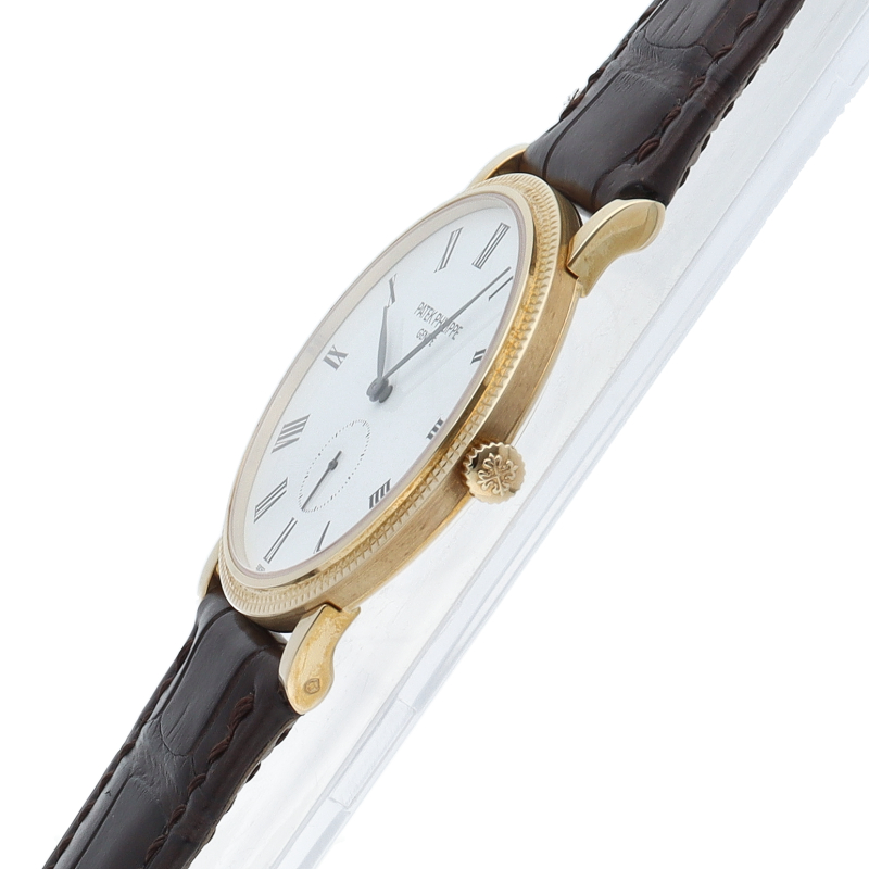 パテックフィリップが誇る人気ドレスウォッチコレクション「カラトラバ」です。艶やかなホワイトラッカー仕上げが施されたホワイト文字盤にはローマ数字インデックスが配置されており針はリーフ型で品の良さを感じさせます。