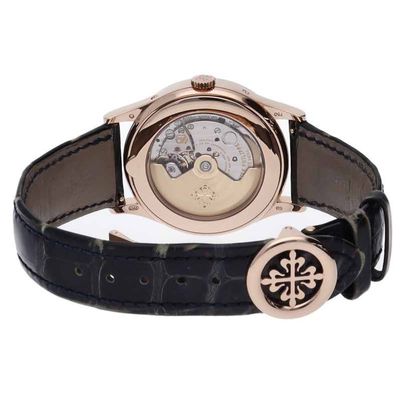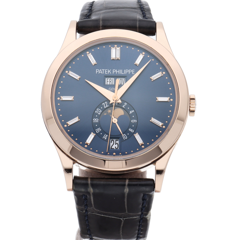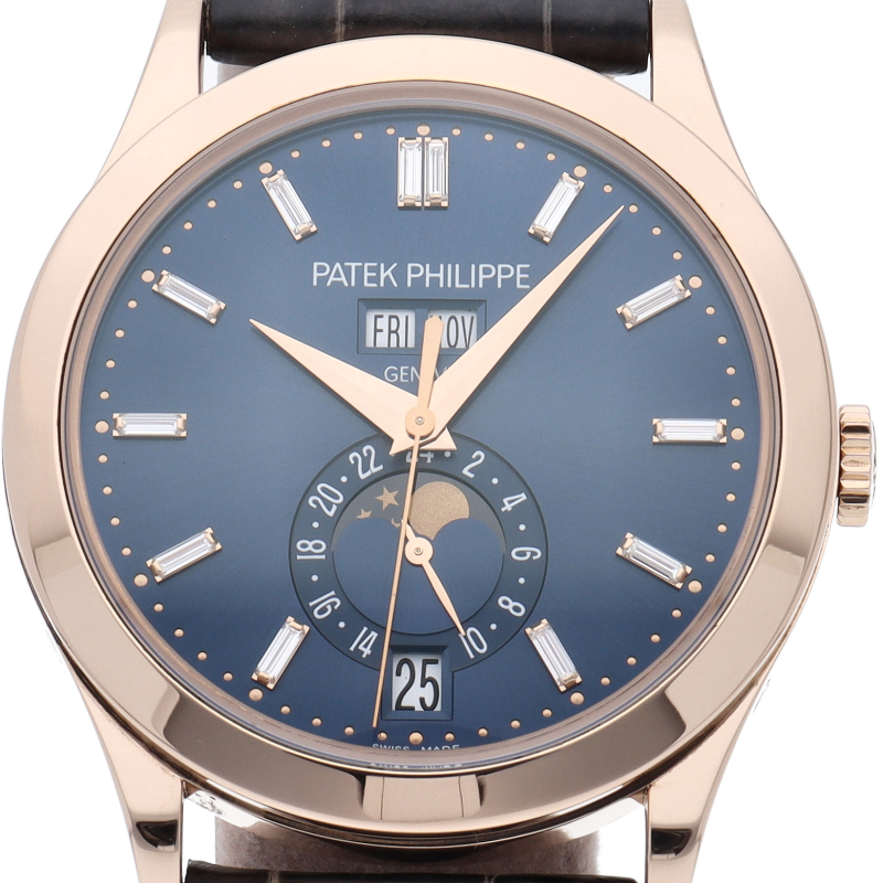 1996年に特許を取得したパテックの年次カレンダー機構。1年に1回のカレンダー操作のみを行う自動巻き「Cal.324」を搭載した、年次カレンダーモデルです。またこちらは通常のタイプとは違い、ブルーソレイユダイアルのインデックスにバケットダイヤを配した豪華なデザインで人気のモデルです。