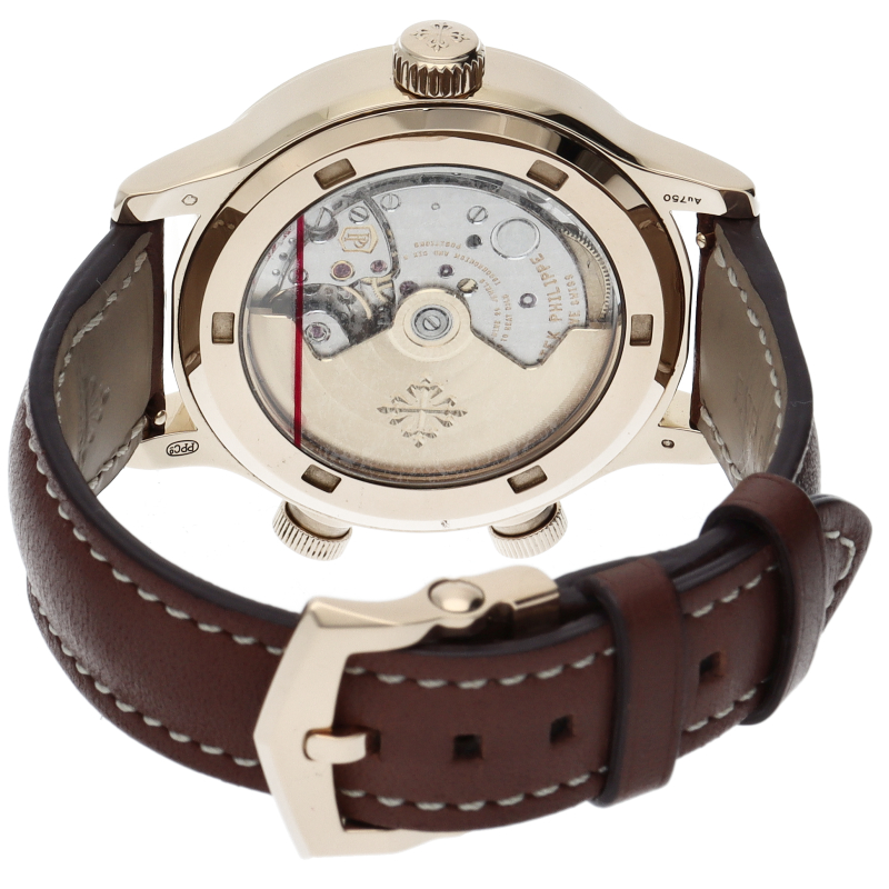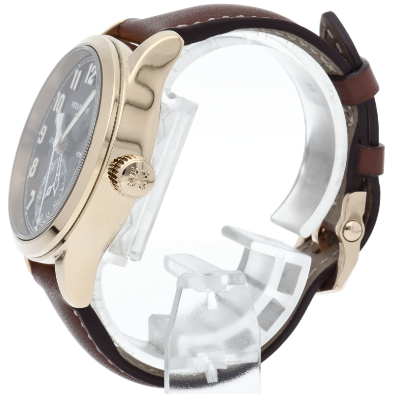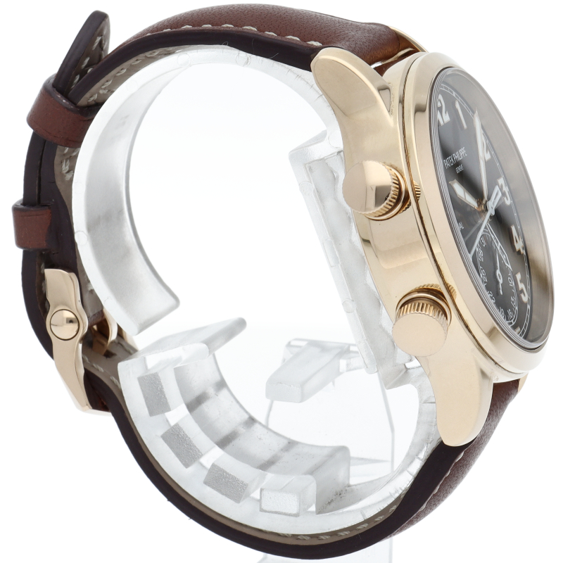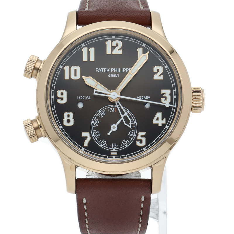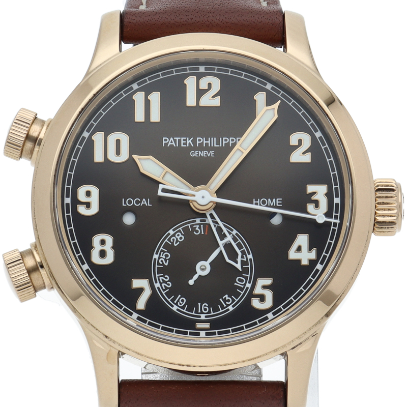 1930年代に作られていたパイロットウォッチにルーツを持つ「カラトラバ パイロット トラベルタイム 7234」。ピンクゴールドのケースには、外に向かって次第にブラックに変わる「ブラウン・ソレイユダイヤル」を合わせています。キャリバー324S C FUS搭載。