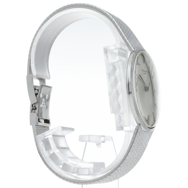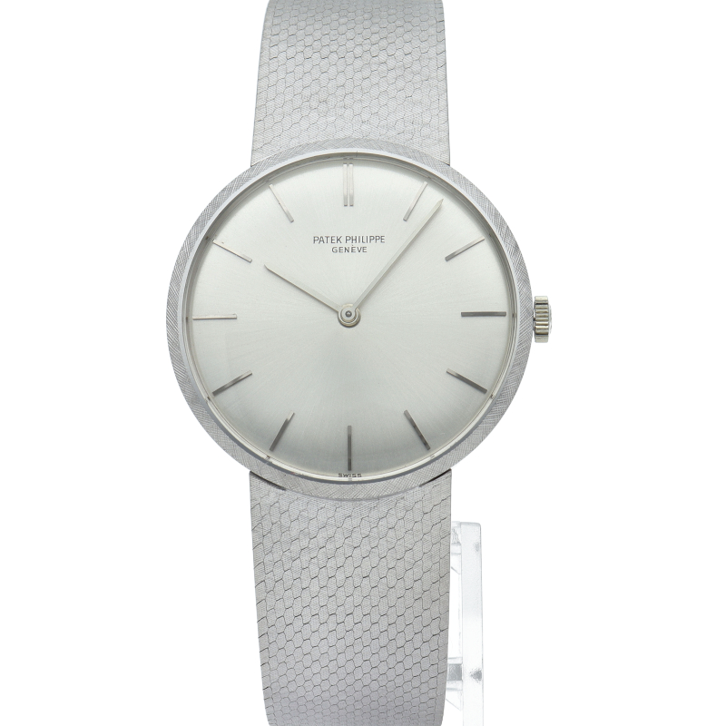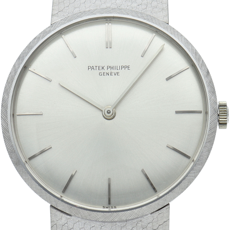 世界最高峰の腕時計ブランドと称される「パテック・フィリップ」。こちらはパテックを代表する人気モデル「カラトラバ」。手巻きCal.23-300を搭載したモデルです。Cal.23-300は、Cal.10-200を薄型化に成功させたキャリバーでジャイロマックステンプを採用しており、その完成度の高さから20年間で58,550個も生産されました。バーインデックスに2針という、よりシンプルなカラトラ