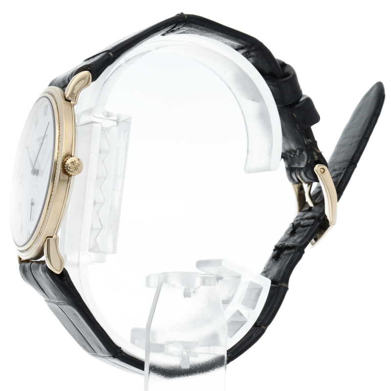 美品。K18YG製尾錠。尾錠はメーカー純正ですが、革バンドは社外品です。革バンドの状態はUSED品のためにかなり使用感が見られます。
