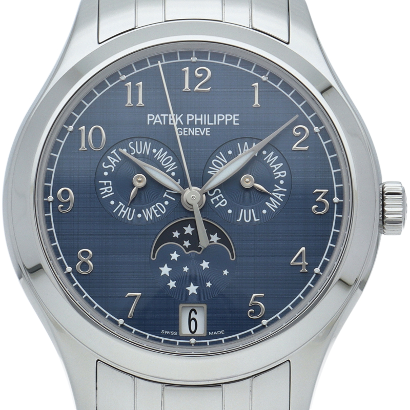パテックフィリップのベストセラーのひとつ年次カレンダー「4947/1A-001」。ケース・ブレスレット共にステンレススチール製を採用し直径サイズが38mmとなりリファレンス番号もレディースのモデルのリファレンス番号が採用されております。ムーブメントにはキャリバー324SQALUを搭載。