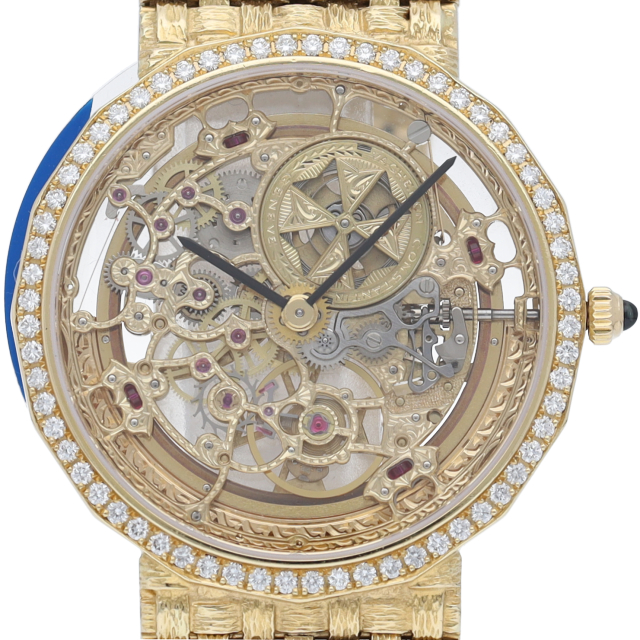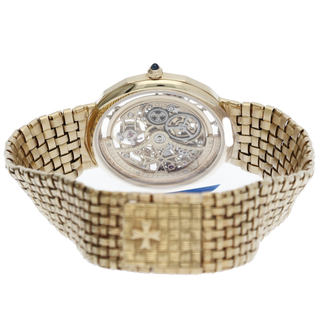 世界3大腕時計メーカーの一角「ヴァシュロン コンスタンタン」。こちらは非常に美しいヴァシュロンのスケルトンモデルです。ヴァシュロンのシンプルな2針を装飾技術を極めた技術者が両面スケルトン加工をし、装飾を施した芸術作です。上品なイエローゴールドケースが装飾をより一層引き立てているモデルです。ブレスレットはメッシュドールです。