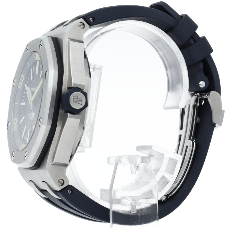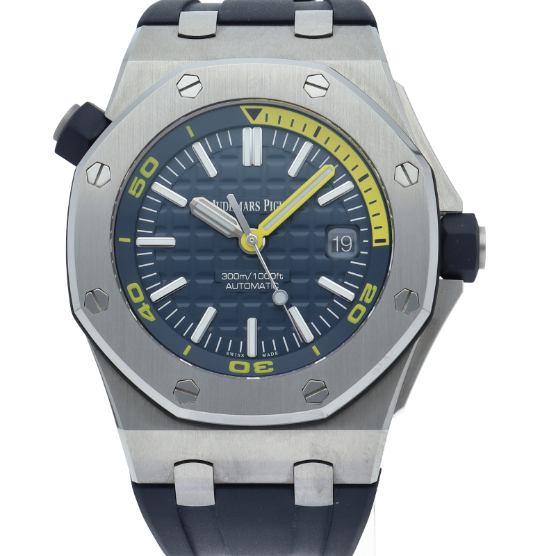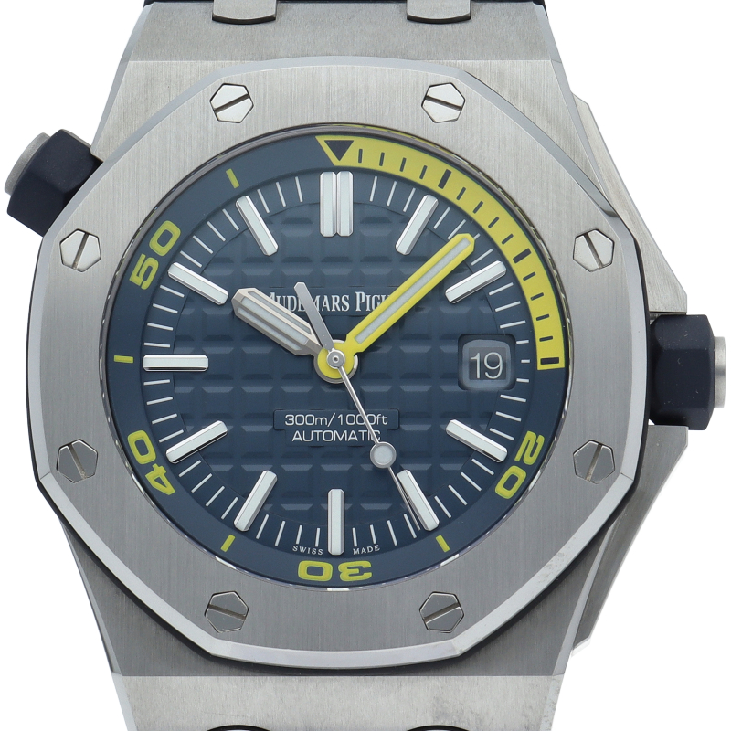 ロイヤルオークの特徴的なケースデザインはそのままに、300mもの防水性能を誇ります。生産終了モデルで、「メガ・タペストリー」模様のブルーダイヤルにイエローの分針とダイビングスケールがアクセントカラーとなっています。