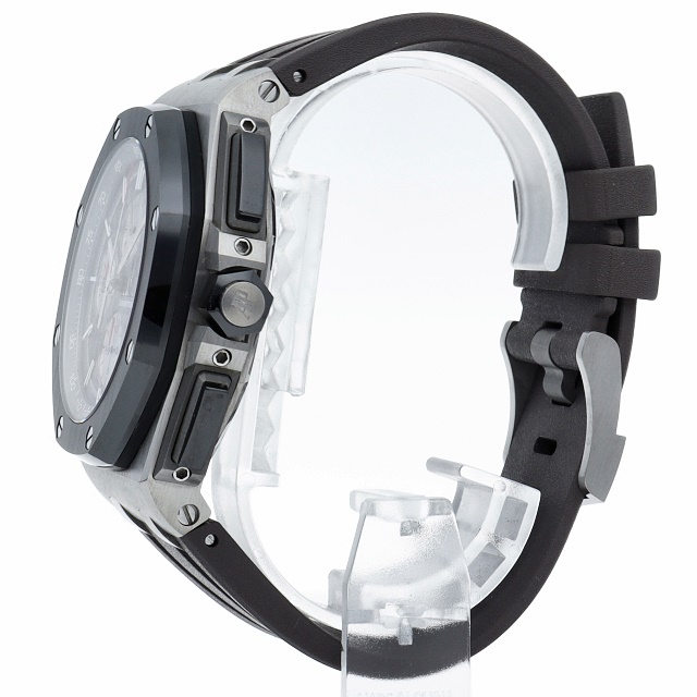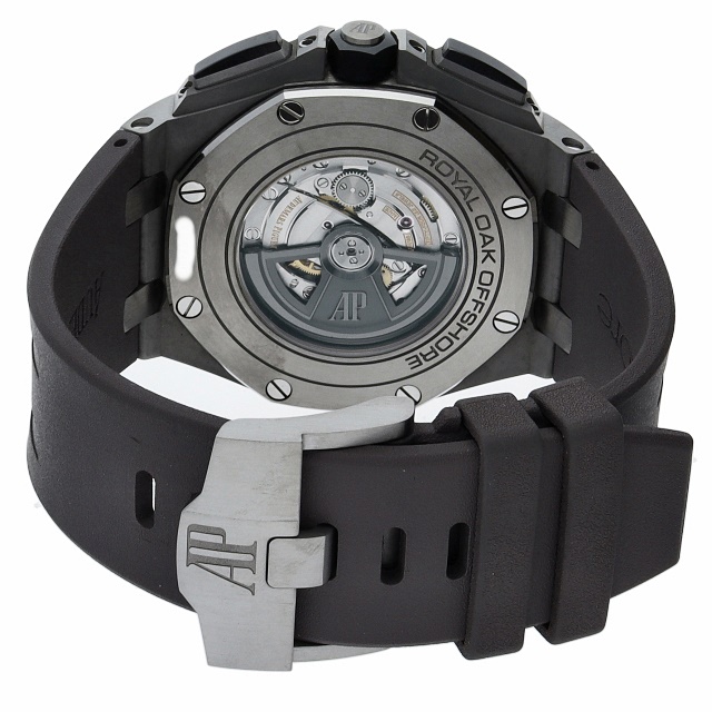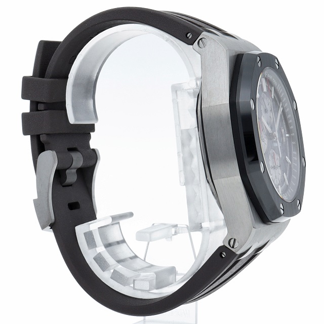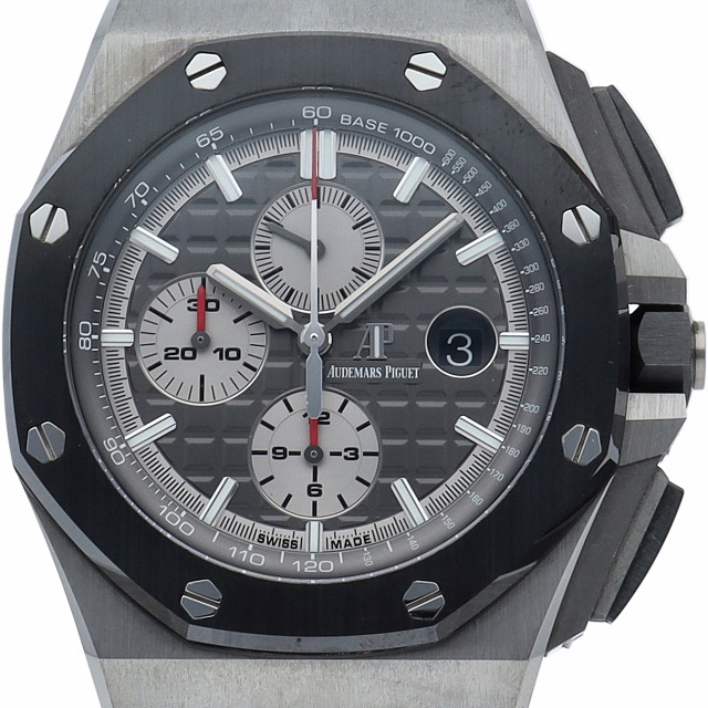 世界三大時計メーカーの1つでオーデマ・ピゲの代表作「ロイヤルオーク」。高級感・機能性・デザイン性全てを兼ね備えたオススメの1本。「メガ・タペストリー」模様のスレートグレーダイヤルにロジウムカラーのカウンター、ラバーストラップを組み合わせたチタンモデルです。ベゼルとプッシュボタン、ネジ込み式リューズは、非常に硬いブラックセラミックでつくられています。