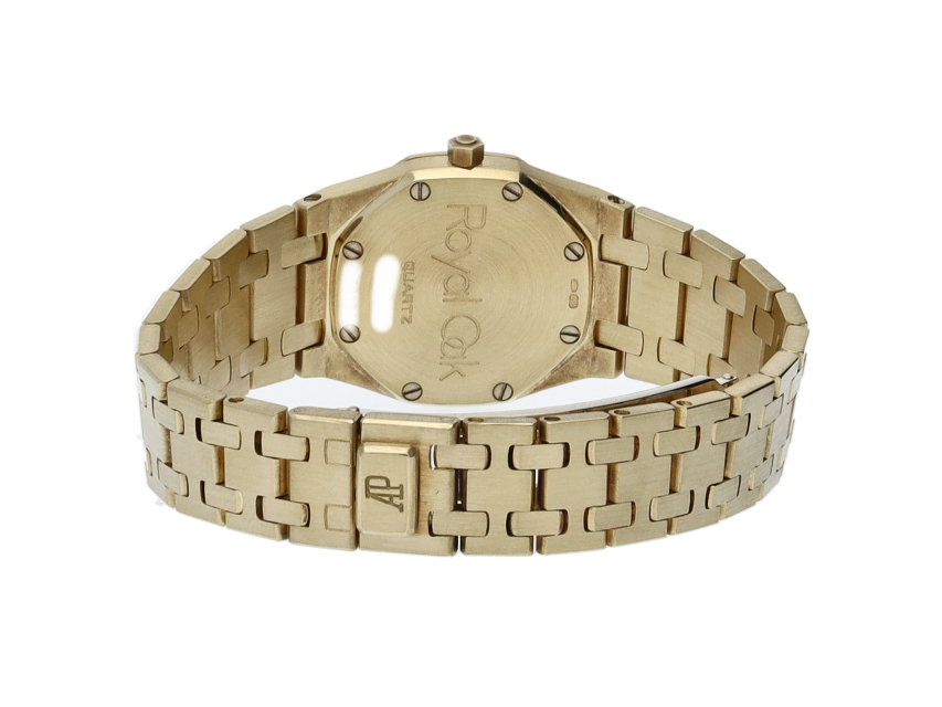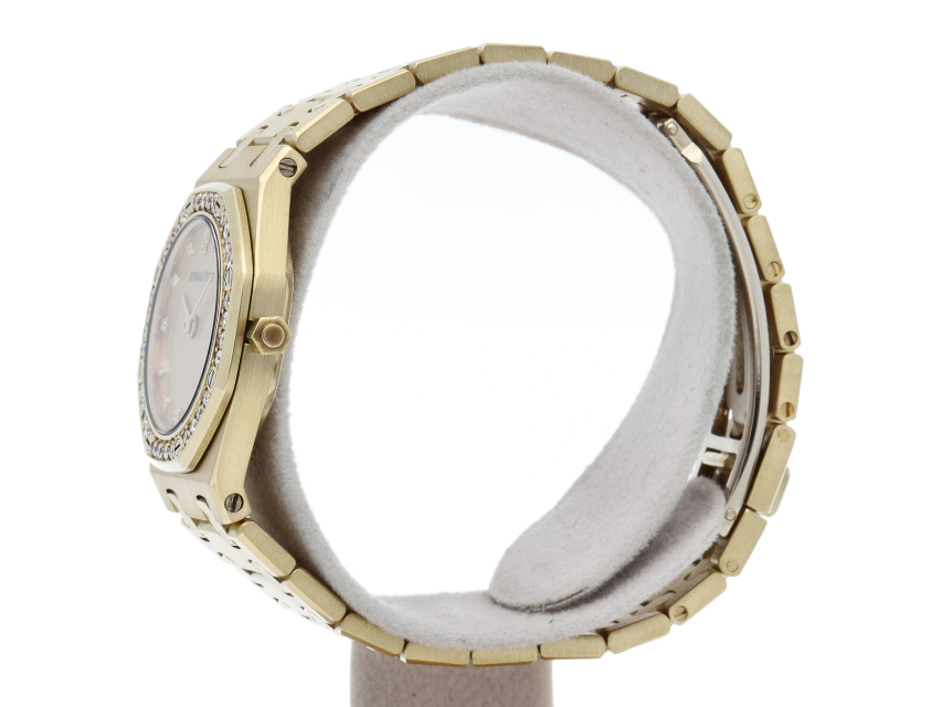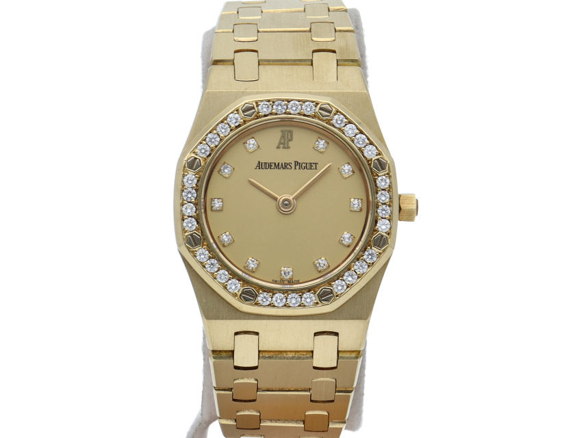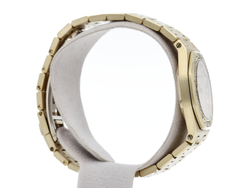 オーデマ・ピゲの人気シリーズで「ロイヤルオーク」です。ケース・ブレスがイエローゴールドが使用され、ベゼルにはダイヤがあしらわれた豪華な1本です。クォーツ時計のため、薄く作られており、実用性も高くオススメです。