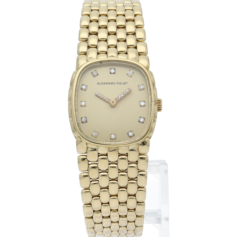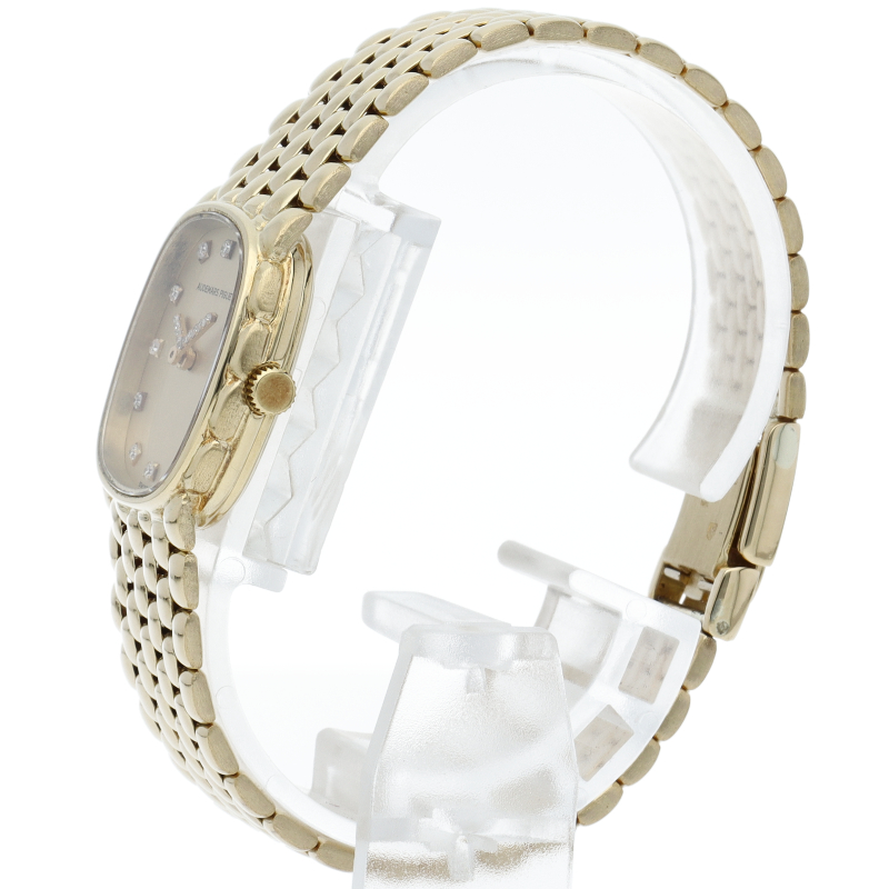 オーデマ・ピゲの人気シリーズで「ロイヤルオーク」です。ケース・ブレスがイエローゴールドが使用され、ベゼルにはダイヤがあしらわれた豪華な1本です。クォーツ時計のため、薄く作られており、実用性も高くオススメです。