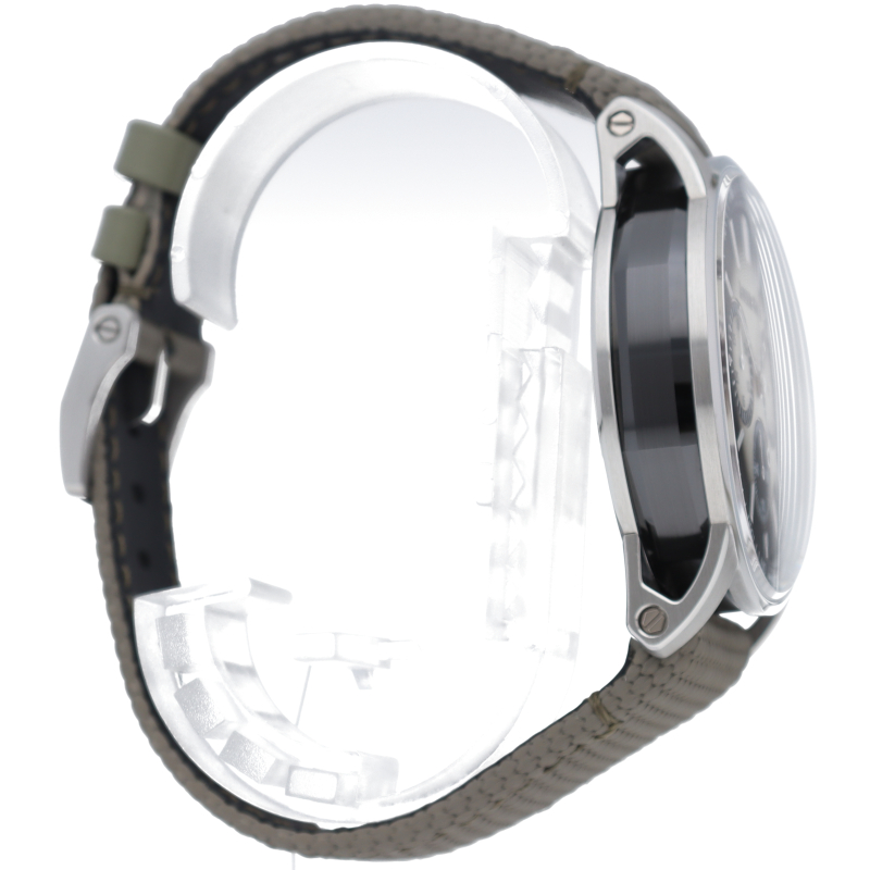 スモークベージュ文字盤とステンレス×ブラックセラミック製ケースの組み合わせがシンプルながらもシックで大人の雰囲気を醸し出しています。ラウンド型のケースに八角形のミドルケースを組み合わせた精巧な立体構造ケースが大きな特徴となっており、複雑な形状をもつ風防は、角度により渦巻き状の模様を浮かびあがらせます。
