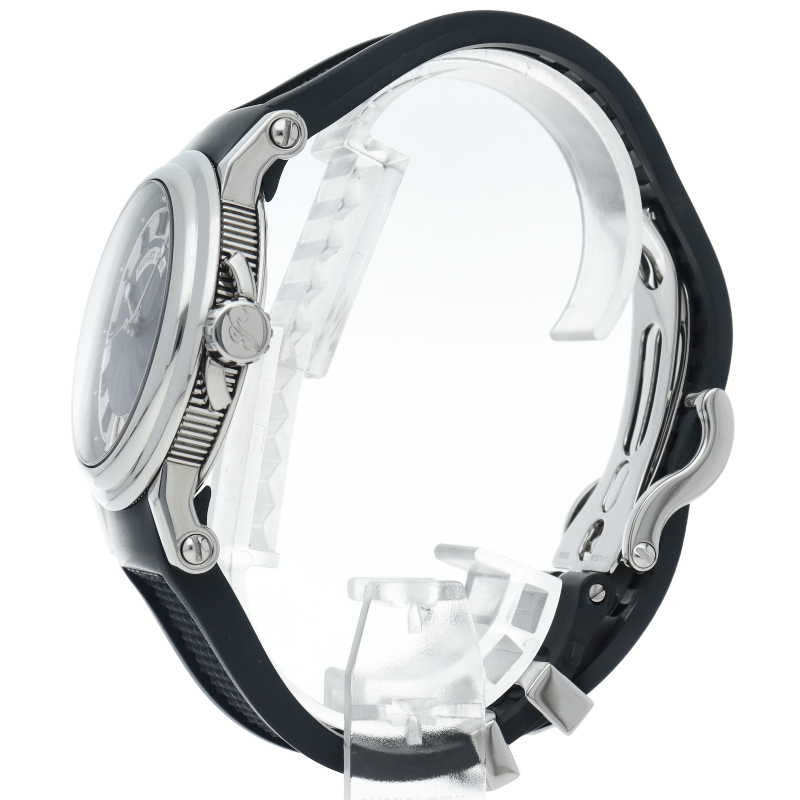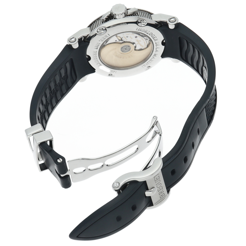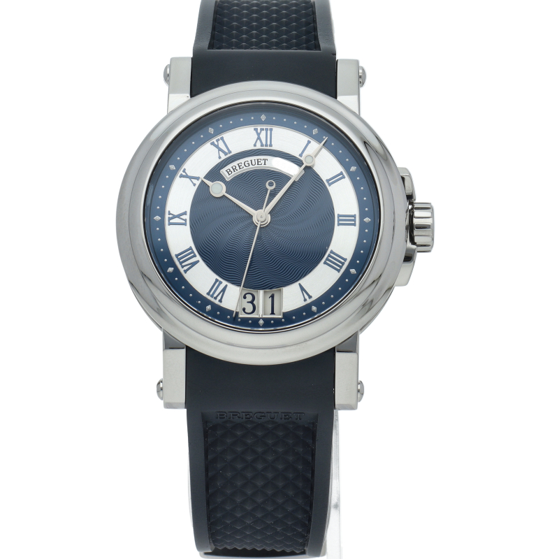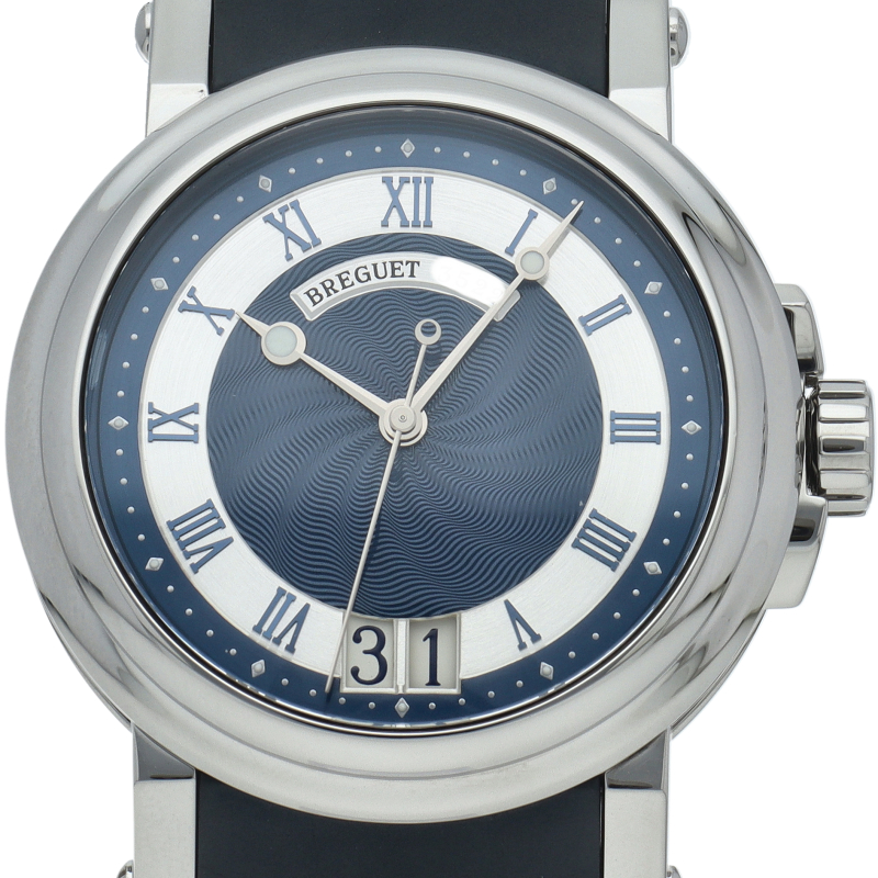 マリーンの名の通り大海を思わせるようなダイヤルのギョーシェ彫り。ブレゲらしい針やインデックス、コインエッジケースなど 同ブランドの魅力がたっぷり詰め込まれた1本です。ビッグデイトの採用により、更なる高級感を醸し出しています。