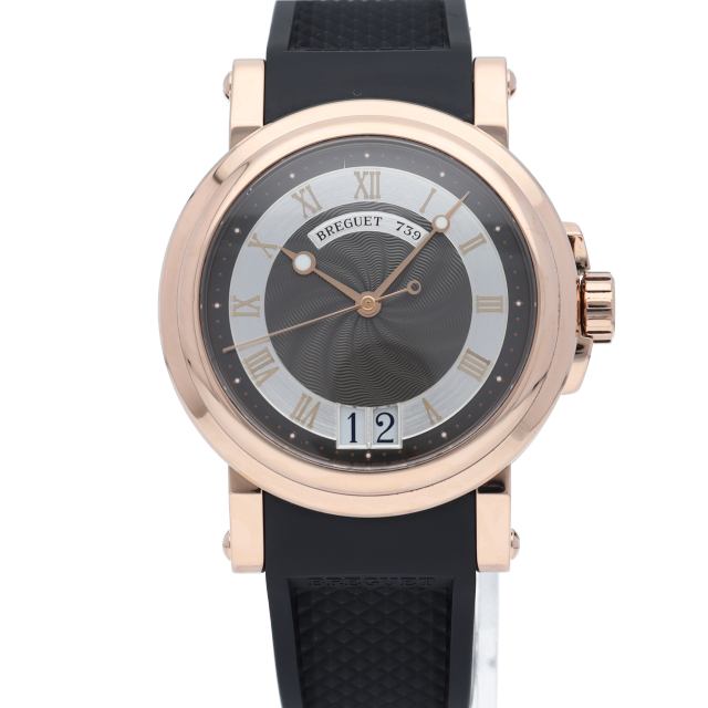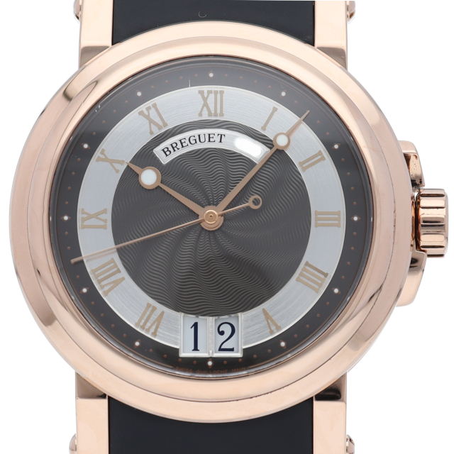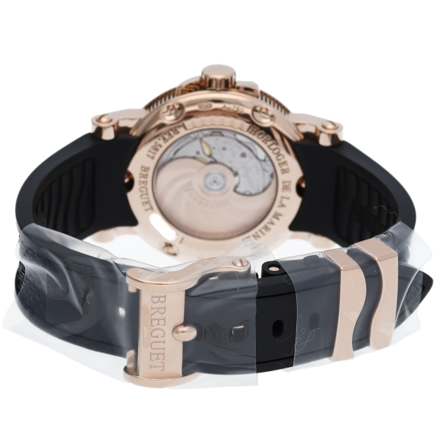 ブレゲの中でも特に人気のあるスポーツライン「マリーン」。こちらはケースにローズゴールドを使用し、高級感あるデザインが人気の秘訣です。裏スケルトン仕様のため、美しいムーブメントをご覧になることができます。